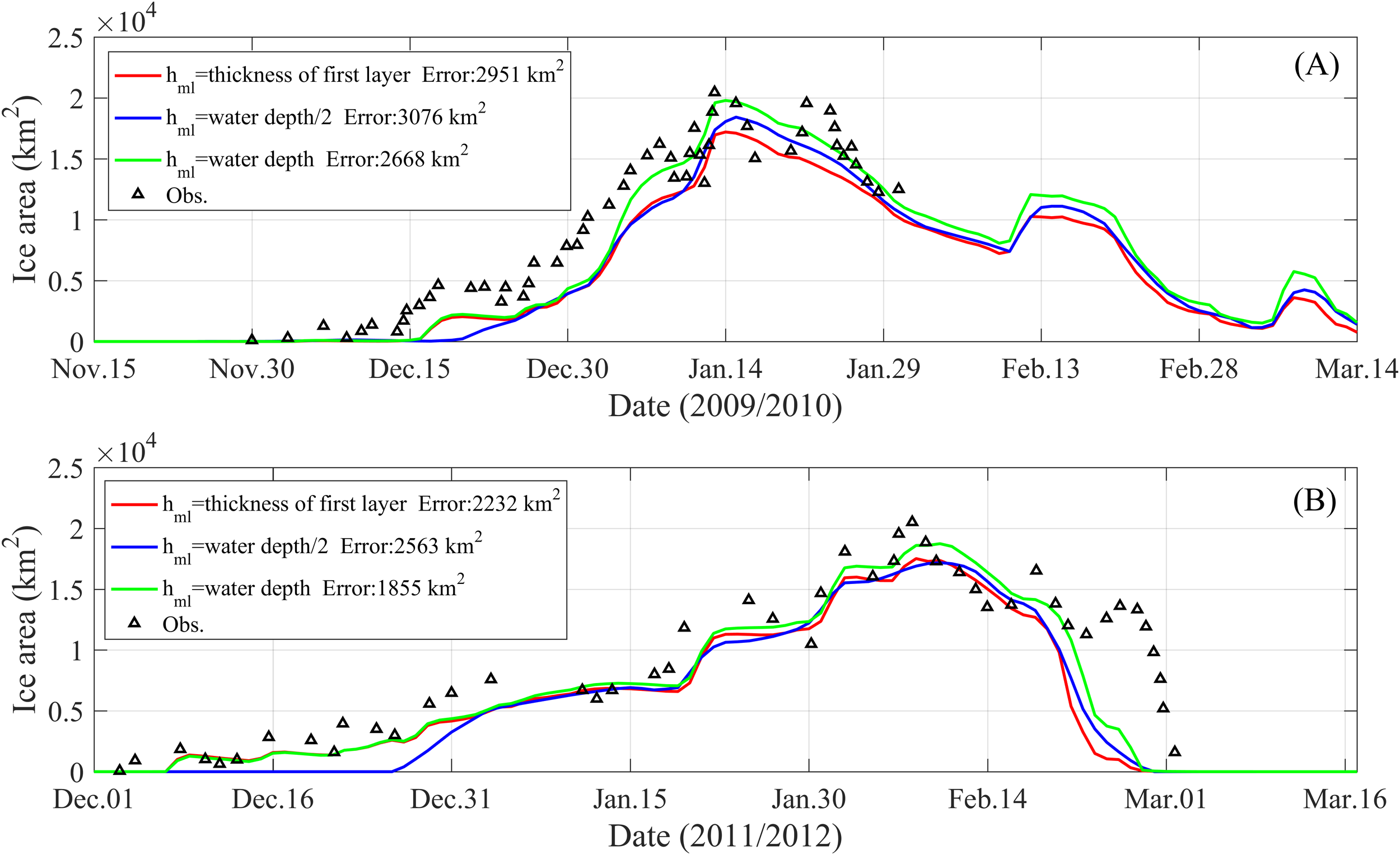 (A) Time series of the simulated ice area obtained by setting mixed layer thickness to the first water layer thickness (default setting, red line), half of the water depth (blue line) and entire water depth (green line) in 2009/2010 ice season. The triangles are the observation data from the satellite inversion. The time-averaged absolute errors of the three simulations are labeled in the legend. (B) Same as graph (A), but for the 2011/2012 ice season.