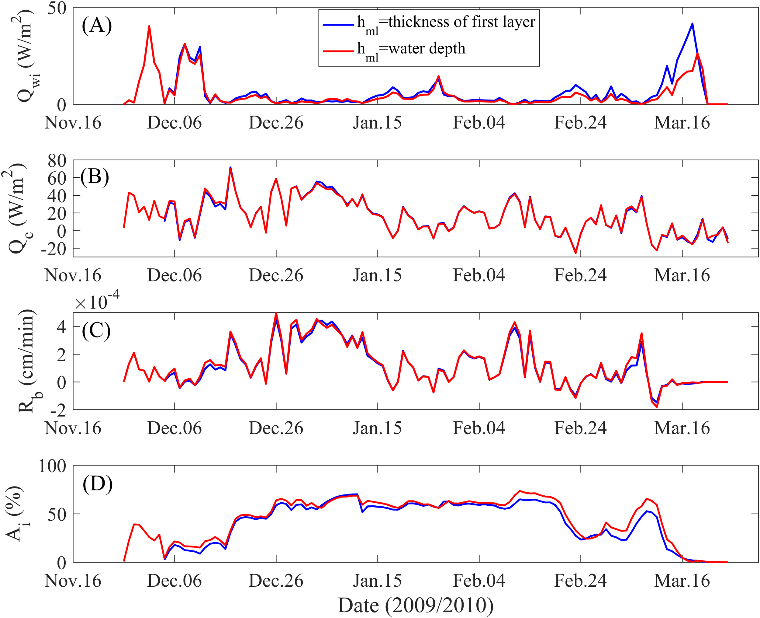 To further clarify the effect mechanism of the mixed layer thickness to the sea ice variables, we present the time series of the ice coverage-averaged interfacial thermal parameters (including oceanic heat flux, conductive heat flux through ice, freezing/melting rate of the ice base (positive values represent ice freezing rates and negative values represent ice melting rates) and ice concentration) obtained by setting mixed layer thickness to the first water layer thickness and the entire water depth in the 2009/2010 ice season as shown in Figure 7. It can be noticed that compared to setting mixed layer thickness as the first water layer thickness (blue lines), there is a significant decrease in the oceanic heat flux especially in the ice melting phase when setting it to the entire water depth (red lines), while the conductive heat flux through ice remains essentially unchanged, and the freezing/melting rate of the ice base grows slightly, as well as the ice concentration.