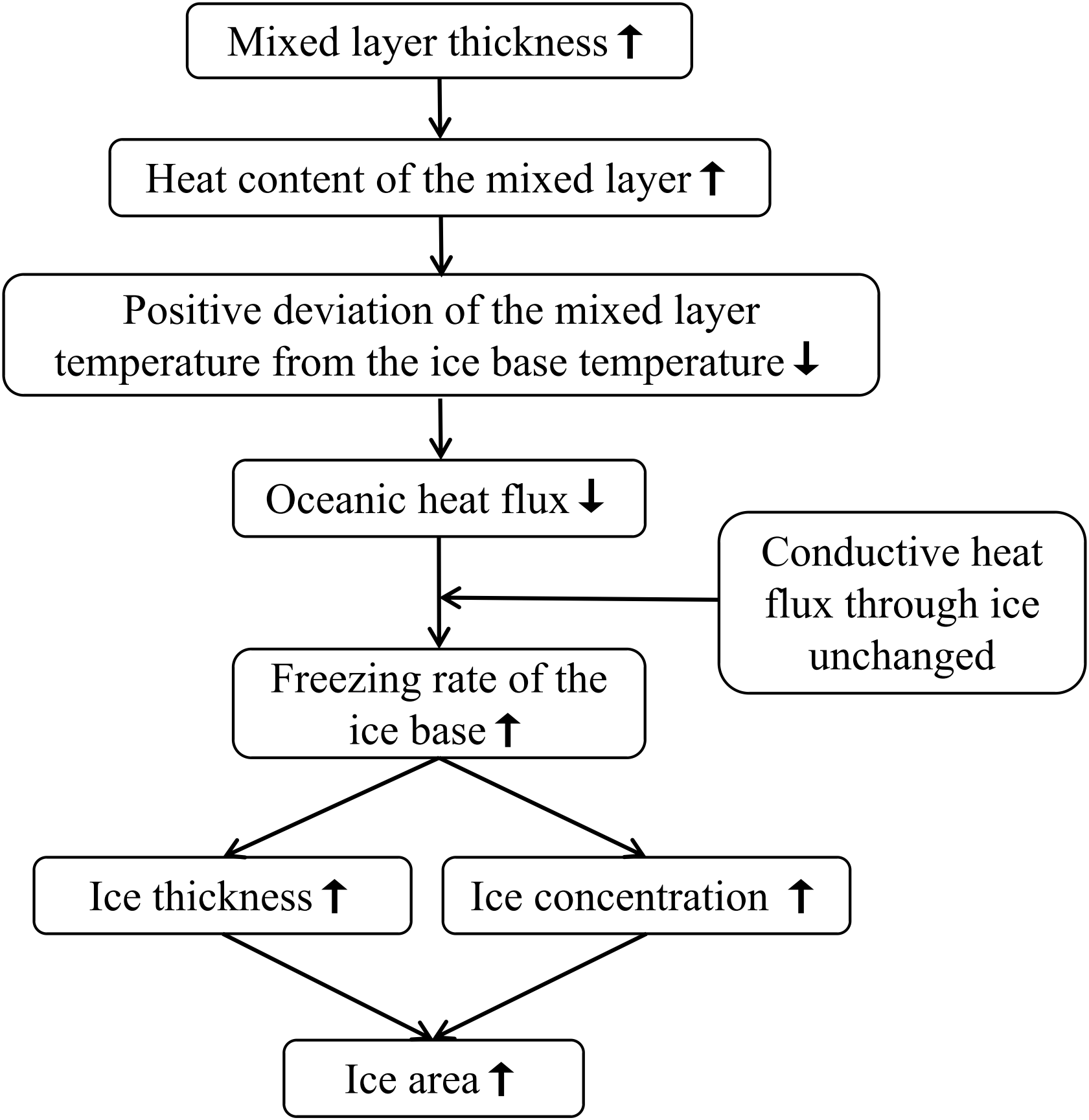 Schematic for the mechanism of the influence of the mixed layer thickness on sea ice variables.