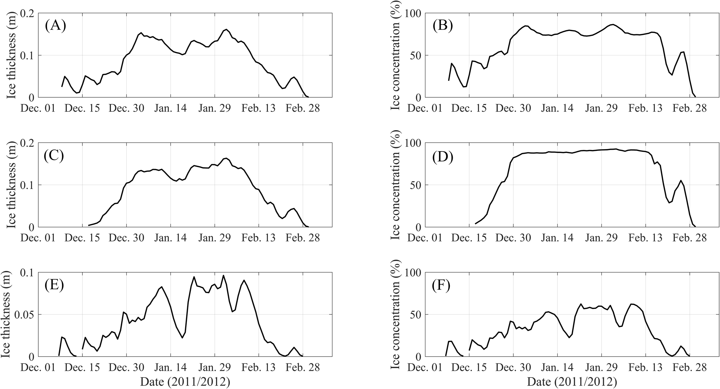 Simulated time series of ice thickness and ice concentration of three local waters [Erjiegou water (L1), Dabijiashan water (L2) and Xipaotai water (L3)] located at the top of Liaodong bay in the 2011/2012 ice season. (A, B) show the ice thickness and ice concentration of Erjiegou water; (C, D) correspond to the Dabijiashan water; (E, F) correspond to the Xipaotai water.