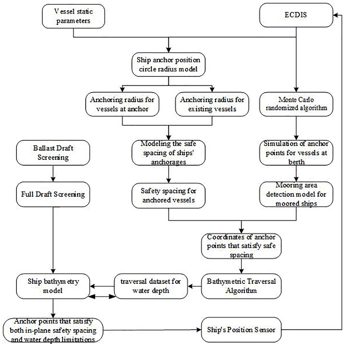 The precision and effectiveness of ship anchor position detection are greatly influenced by intelligent detection technology for anchor positioning, which is one of the critical technologies to guarantee ship safety and enhance port operation efficiency against the backdrop of rapidly developing intelligent ship technology. The traditional planar, two-dimensional observation method is still commonly used today when ships perform anchoring operations. This means that in real operations, the captain’s comprehensive assessment of the ship’s distribution, wind, and wave currents, and other external environments is typically used to determine the ship’s anchor position. To protect the ship during anchoring operations, an increased anchoring radius is typically used, which partially results in the waste of anchorage resources. On the other hand, there can be risks if the anchoring radius is set too short. As a result, this anchor position selection approach struggles to fulfill the demands of modern navigation practice due to its low accuracy and significant risks. However, the majority of existing anchor detection methods do not account for the relationship between the ship’s draft and the anchorage area’s depth, which could reduce the accuracy of the anchor detection model and make it more difficult for crew and shore management staff to accurately assess the anchorage area’s safety. Additionally, ships frequently encounter large ships anchored in deep water in the anchorage area during normal shipping operations. In the field of intelligent ships, a key technology that needs to be researched is an intelligent anchoring detection system that combines high efficiency with good safety performance.