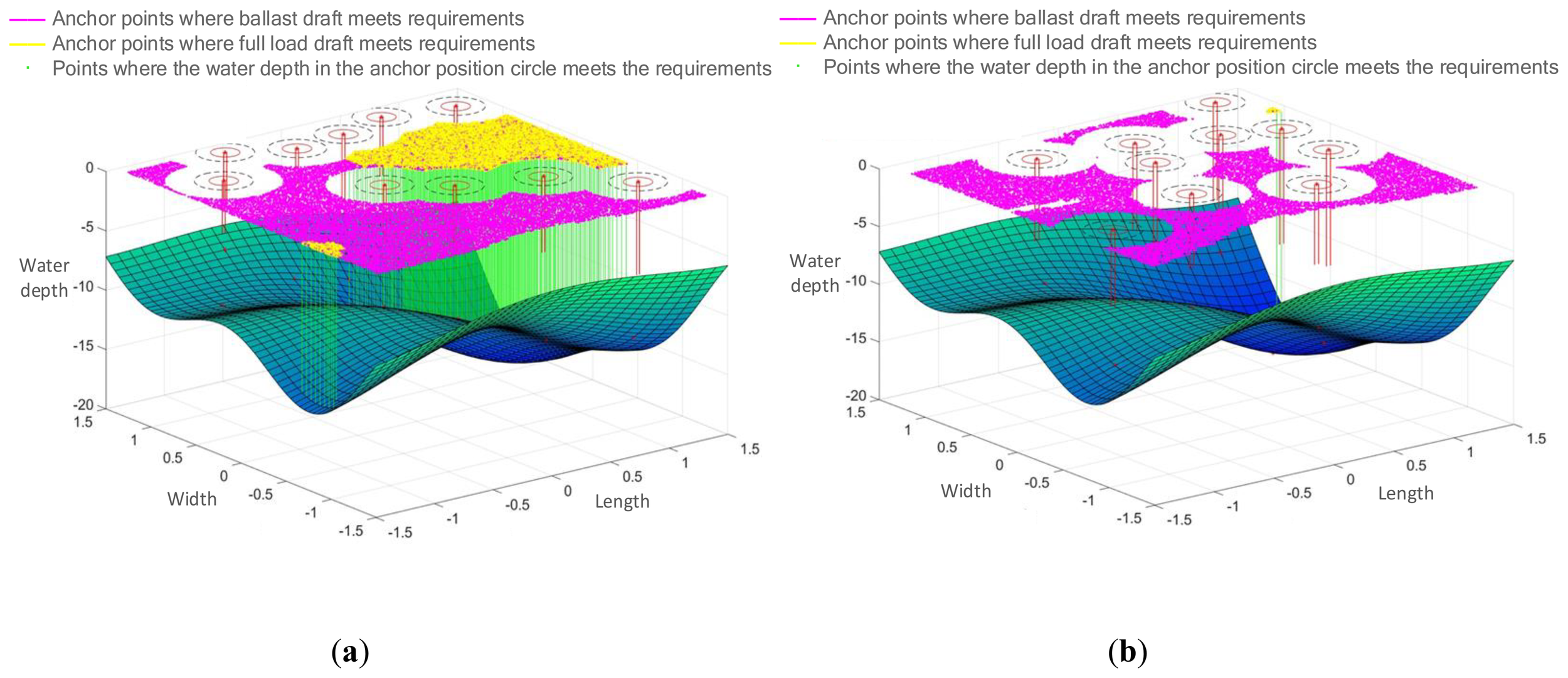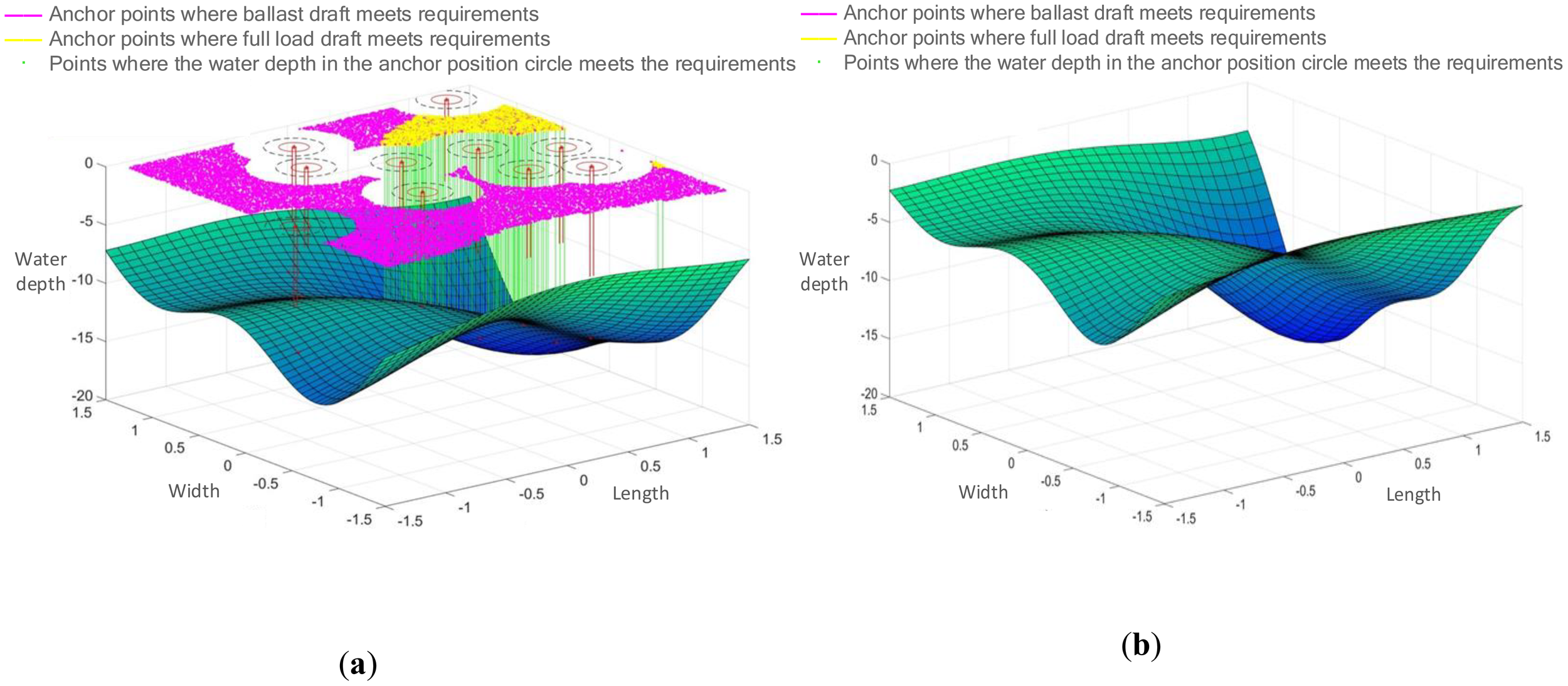 Step 9: The results obtained from the traversal are checked against the model (5) and the water depth values in Table 1. If all points traversed within this anchor position circle satisfy the water depth requirement, then this point is the anchor position point of the ship to be anchored that satisfies the 2D planar and 3D water depth requirements and is labeled with this coordinate as , … . The set of coordinates is .