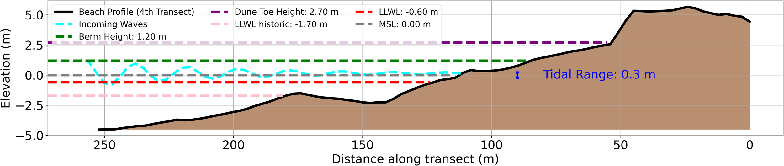 Figure 8 illustrates the locations of the transects, which are incrementally numbered from southeast to northwest, corresponding to the direction of net sediment transport. Each transect is approx. 250 m in length, encompassing the dune, beach, and foreshore, extending to a depth of approx. 4.5 m below MSL. To the south of the study area, a breakwater restricts longshore sediment transport. Further south, the coastline transitions to a cliffed coast. Notably, the shoreline angle relative to the wave direction becomes steeper moving northward, with a significant directional change occurring between transects 2 and 3. All transects, except for transect 5, are located in areas equipped with groynes. The satellite imagery reveals a system of two sandbars extending across most of the transects, with notable switching episodes between transects 2 and 3, where the inner and outer bars switch positions or merge to form a single bar.
