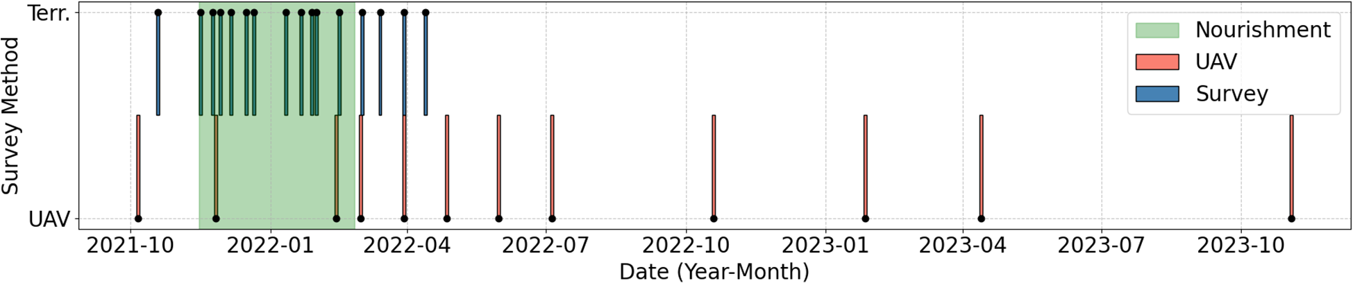 Timeline of the available complementary survey data. The surveys were conducted by a contractor at five transects inside the nourishment area. UAV: Photogrammetric surveys of the nourished area and adjacent beach segments. The green rectangle marks the period during which the nourishment was conducted.