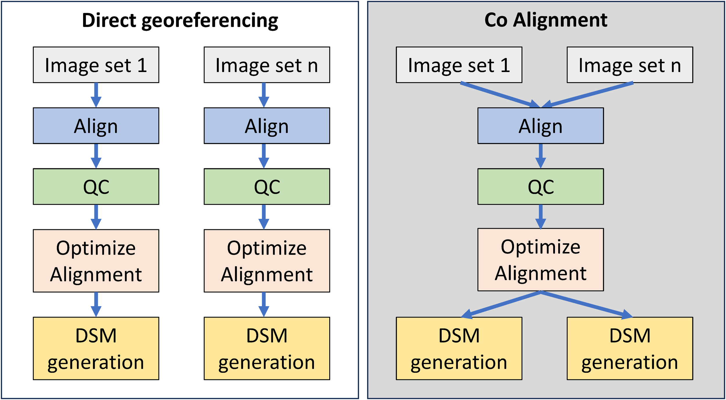 We employed four distinct processing workflows to compare their accuracy (Figure 5). The first two workflows utilized direct georeferencing from the RTK UAV: one using only nadir images and the other incorporating both nadir and oblique images. The remaining two workflows followed a co-alignment approach: one using only nadir images and the other incorporating both nadir and oblique images, where all images were initially aligned together and then segmented into the respective surveys.
