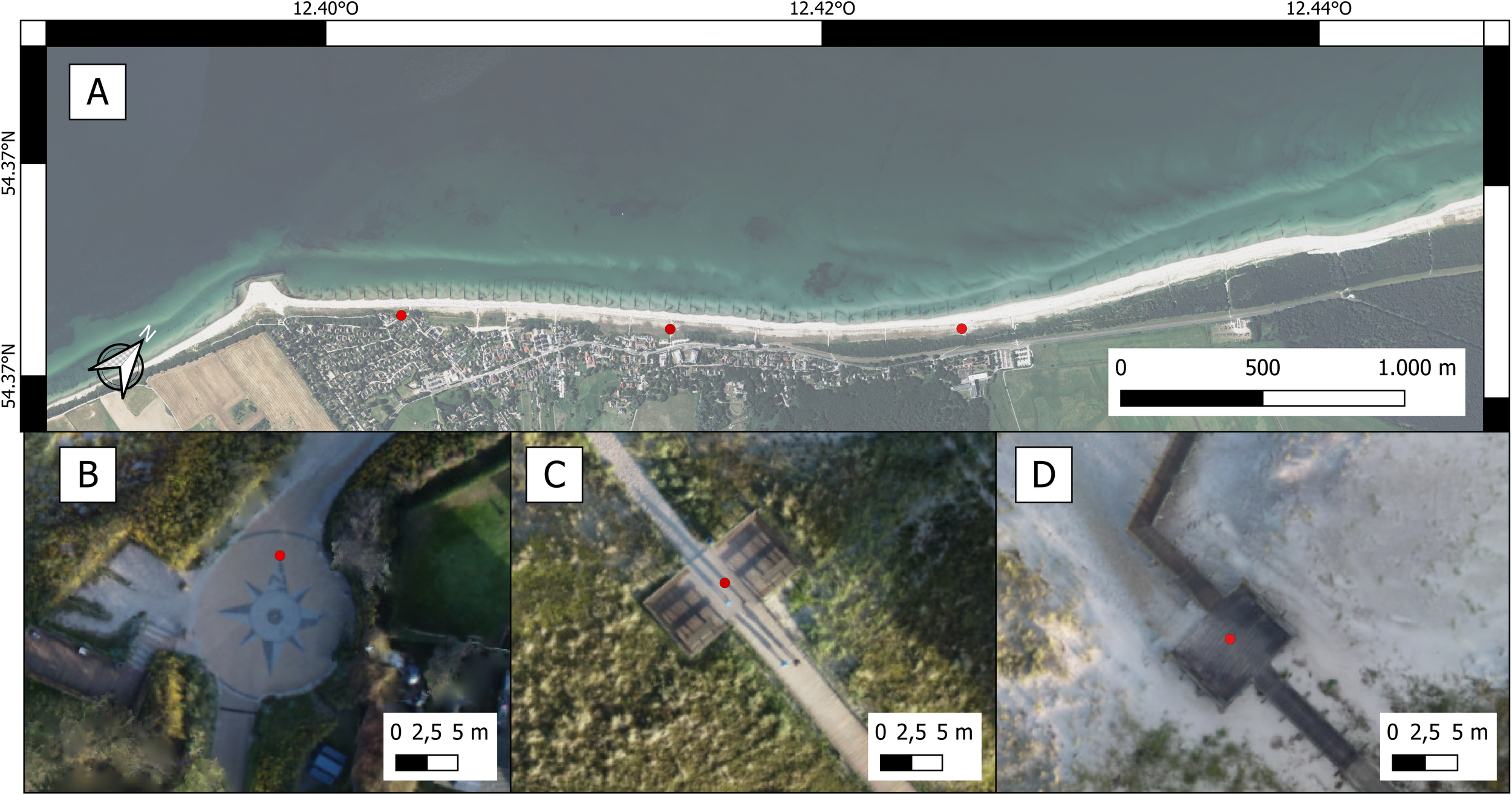 An additional processing step that can enhance accuracy is a technique known as co-alignment. Cook and Dietze (2019) suggested that a high comparative accuracy between repeat UAV-surveys of the same study area can be achieved by aligning the images of different surveys together instead of processing them separately. After this alignment, the images are then divided by their respective survey date and processed further. This approach allows the forced alignment of poorly aligned surveys. A prerequisite for this to work is the presence of common elements in the surveys. In the case of the study at hand, common elements like the groins, infrastructure for access to the beach, or coastal view platforms make it suitable for this approach. As the groynes and coastal view platforms on the dune form the natural boundaries for the measured area, the alignments should be very reliable in contrast to a case where the only features available for alignment are in the center of the study area, leaving degrees of freedom open to the alignment process.