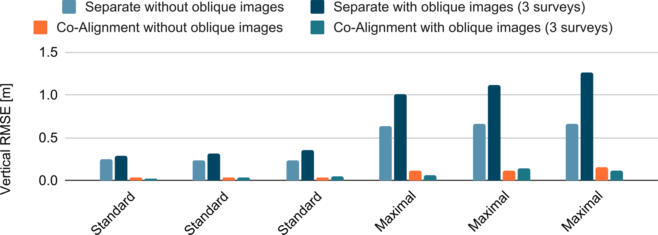 Bar plots illustrating the performance of four workflows across three check points, as depicted in Figure 6. The workflows include separate processing with and without oblique images, co-alignment with and without oblique images. The oblique images, acquired for three surveys, were incorporated into the respective processing workflows. Performance metrics are presented by the standard deviation and maximum differences calculated across surveys.