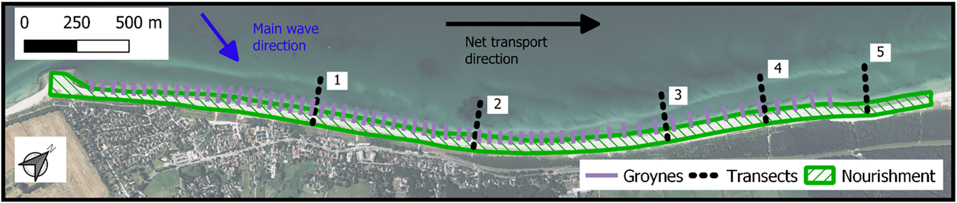 In this study, we focus on a section of the German Baltic Sea coast and the evolution of local beach profiles after a large-scale beach nourishment (Figure 1). Due to the reliance on dunes, sand nourishments are a vital part of the coastal protection strategy of the state of Mecklenburg-Western-Pomerania (MWP) including the study area. In the past, the combination of natural coastal development, coastal infrastructure, and protection measures has complicated the assessment of the effect of these nourishments. The current strategy is to react to the changes seen on the beach and replace the sand that was washed away by the usual sea state and storm impacts. To improve these practices, a deeper understanding of the shoreline dynamics is fundamental for planning the commitment of sand supplies along the coast, especially considering the challenges in the form of SLR lying ahead.