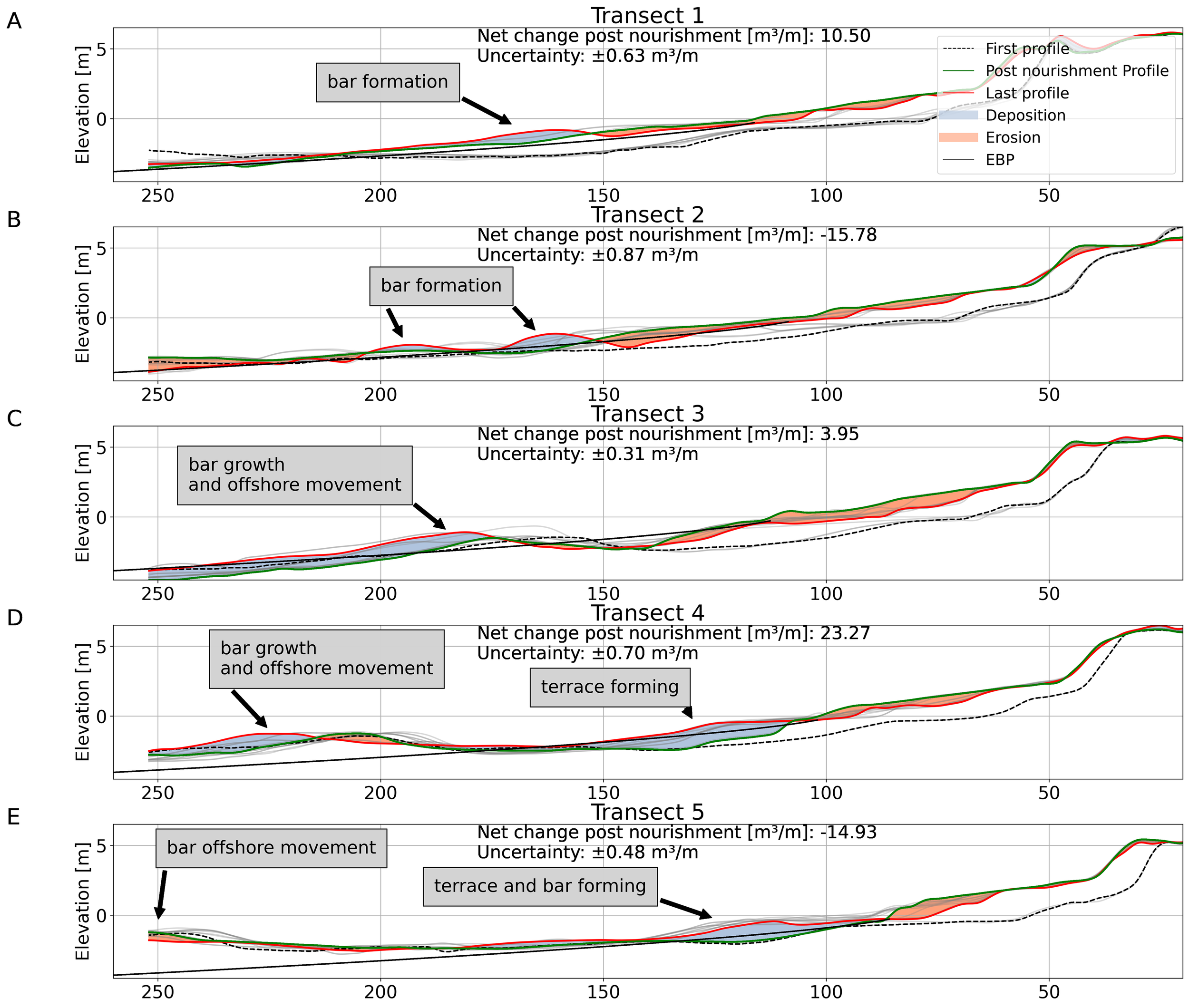 In contrast, transects 3 through 5, being more exposed, experience more distinct responses compared to transects 1 and 2. Transect 3 experiences moderate dune accretion and corresponding beach erosion, with minor foreshore erosion. A total nourishment of 76.66 m³/m was carried out, resulting in a positive change of 3.95 ± 0.31 m³/m. Notably, the pre-existing sandbar undergoes offshore migration while concurrently augmenting in elevation. Transect 4 shows minimal dune and beach erosion, juxtaposed with strong foreshore accretion, following a nourishment of 54.49 m³/m. Post-nourishment observations revealed a positive change of 23.27 ± 0.70 m³/m. The seaward displacement of the existent sandbar leads to the development of a terrace. The resulting profile looks very similar to the pre-nourishment profile, though moved further seaward.
