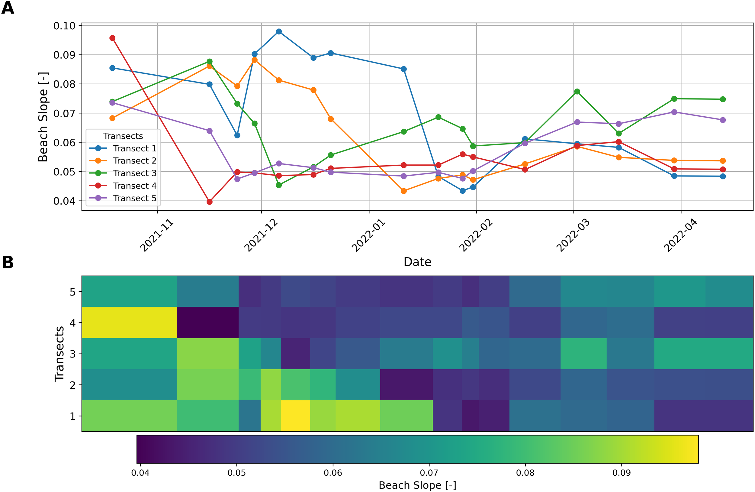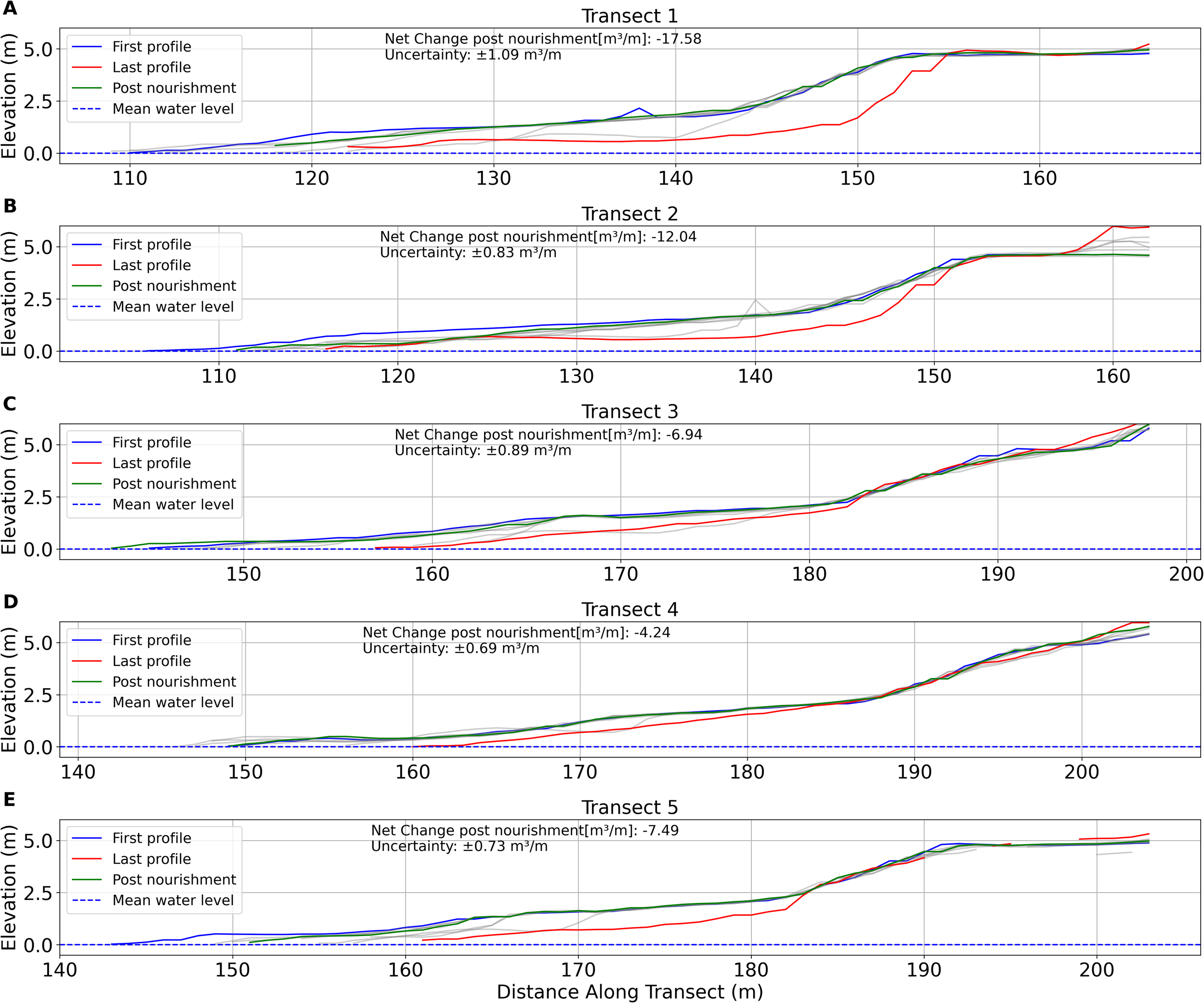 We conducted a comprehensive analysis to examine sediment volume changes following nourishment efforts. Utilizing the survey data spanning from October 2021 to March 2022, covering the nourishment construction period, and UAV data extending from October 2021 to November 2023, encompassing the post-nourishment period, we scrutinized profiles along each of the five transects within the project area. The transects are distributed over the study area and displayed in Figure 1B. The transects in this study were spaced at an average distance of 650 meters, a spacing determined by logistical constraints but recognized as a potential source of significant error in volumetric calculations. This wide spacing raises concerns about the accuracy of estimating beach-wide volumetric changes, as it is likely to miss critical morphological features that exist between the widely spaced transects. According to the findings of Muñoz-Pérez et al. (2012), errors in volumetric estimation increase substantially as transect spacing widens, particularly beyond 300 meters. With a spacing of 650 meters, the error in estimating total volumetric changes across the entire beach could exceed 100%. This high error margin stems from the likelihood that significant profile variations—such as dunes, erosional features, or other critical changes—are not captured, leading to substantial under- or over-estimations of the beach’s volume.