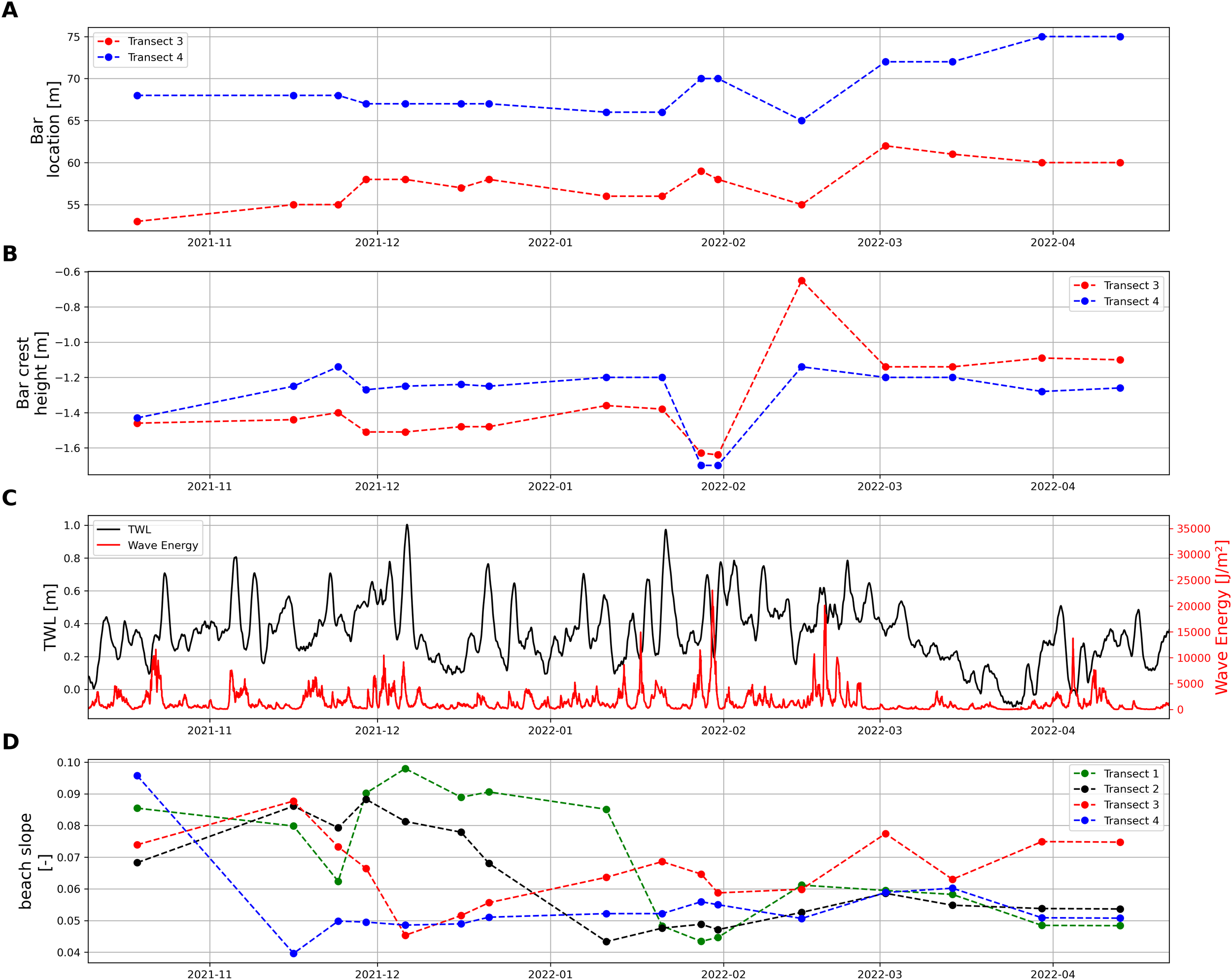To assess the underlying drivers and impacts leading to documented morphological changes on site, we coupled the erosion and deposition trends of the nourishment to data from a wave buoy off the coast. As the main drivers, we calculated the cumulative wave energy between the survey time steps, total water level, including the wave runup, and wave direction.