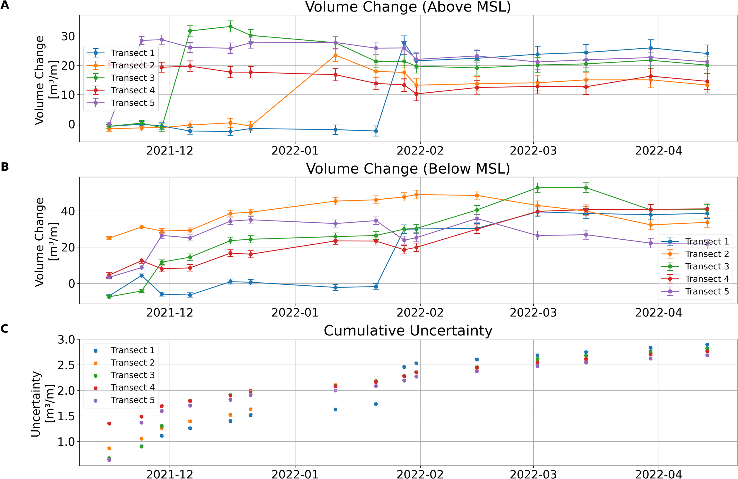 Then the cumulative uncertainty in volume change for each transects is propagated across the surveys using a quadrature sum of the uncertainties in each time step: