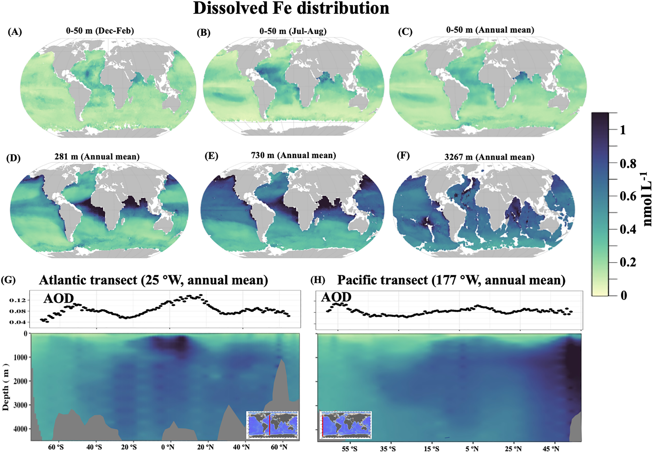The global modeled dissolved Fe using the random forest approach. (A–F) show global maps of modeled dissolved Fe at various depth horizons; (G, H) display the corresponding dissolved Fe transects across the Atlantic and Pacific.
