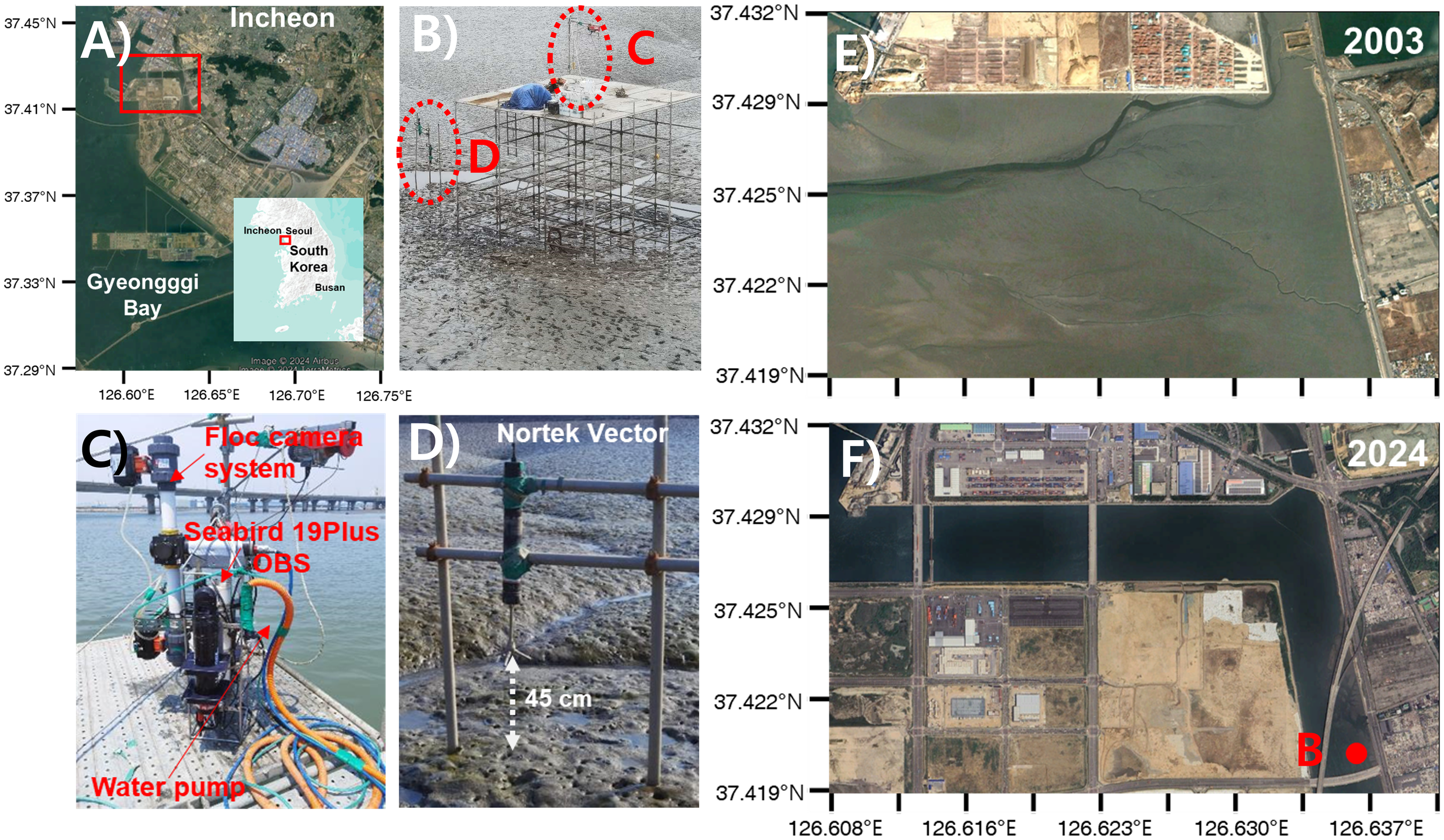 Location map of the Aam tidal channel and observation sites. (A) Map of South Korea showing the location of the Aam channel. (B) Photo of the system support where mooring and casting surveys were conducted. (C) Photo of the instruments used for casting surveys, including the floc camera system for observing settling velocity, the Seabird 19Plus for measuring temperature, salinity, and depth, the OBS for turbidity measurements, and the water pump. (D) Photo of a Nortek Vector mounted on an H-frame. (E) Satellite image of the Aam channel taken before land reclamation in 2003. (F) Satellite image of the Aam channel taken after land reclamation in 2024, indicating the observation station. The inset shows a photo of the scaffolding platform used for casting observations.
