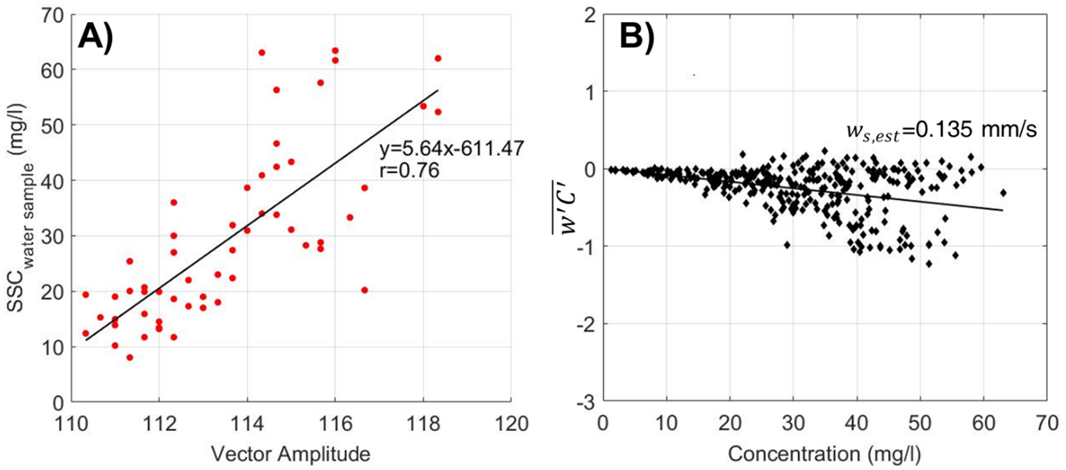 (A) Calibration of Vector amplitude against water sample-derived SSC. (B) Settling velocity calculations using Reynolds concentration flux versus sediment concentration.