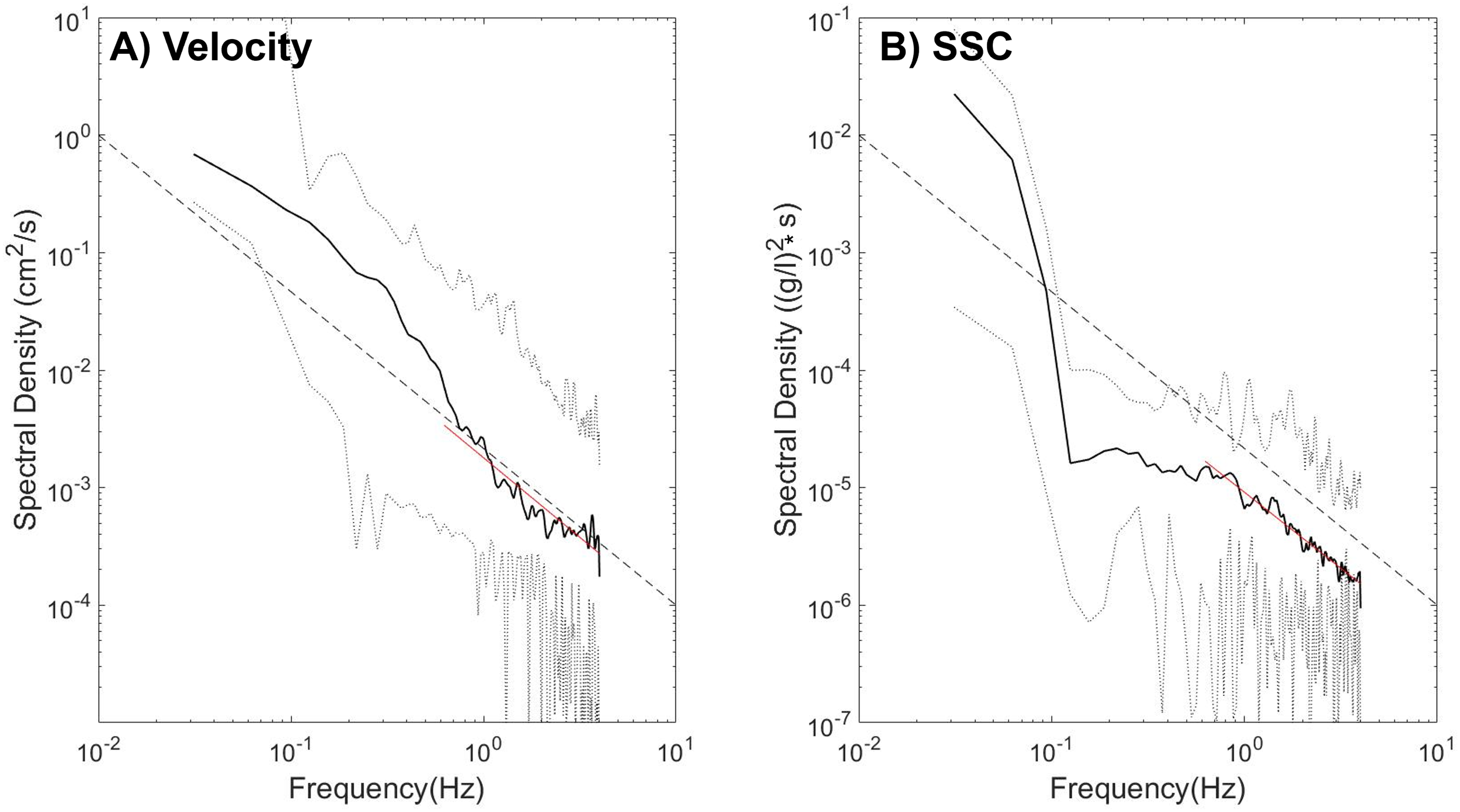 Spectra of vertical turbulent velocities (A) and SSC (B) measured at 45 cm above the bed. A -5/3 slope line is indicated in red for comparison. The gray lines indicate the 95% confidence level.