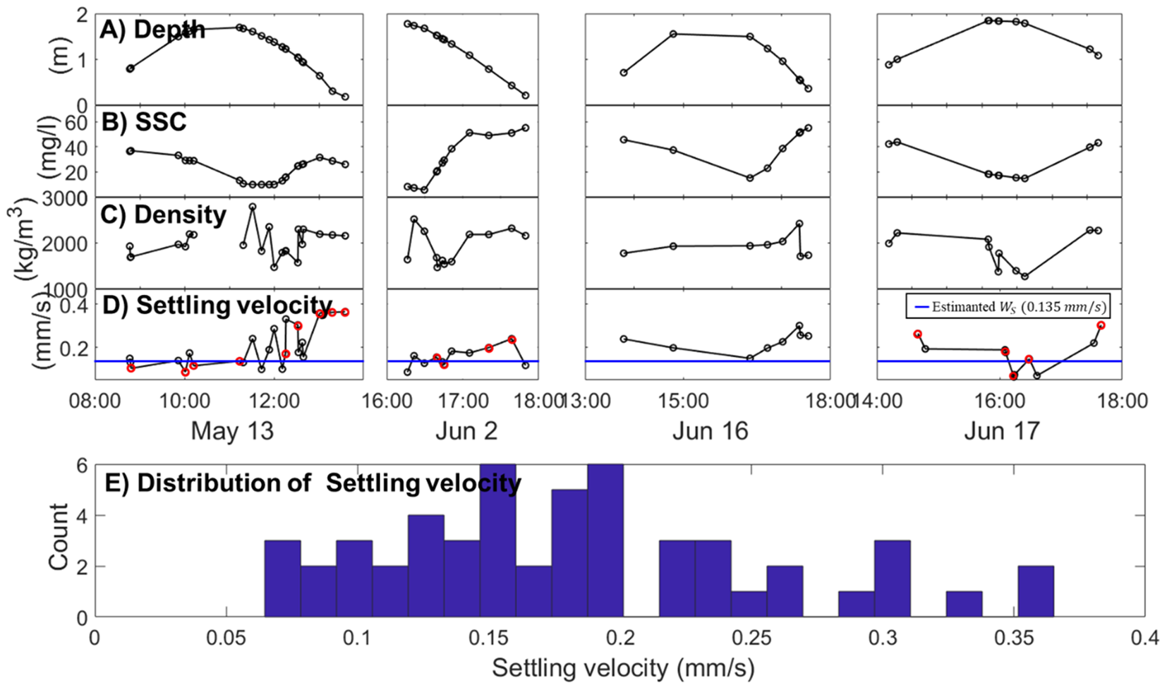 Characteristics of casting survey data. (A) Depth variations during the casting survey acquired from CTD, with circles indicating observation times. (B) Suspended sediment concentration. (C) Changes in floc density acquired from the floc camera system. (D) Changes in settling velocity of suspended sediments acquired using the floc camera system. (E) Distribution of settling velocities over the four casting surveys using the floc camera system. The estimated settling velocity (0.135 mm/s) based on equation (16) was represented by the blue line. The red dots represent the points where floc camera observations overlap with quality-controlled TKE data, used for comparing settling velocities.