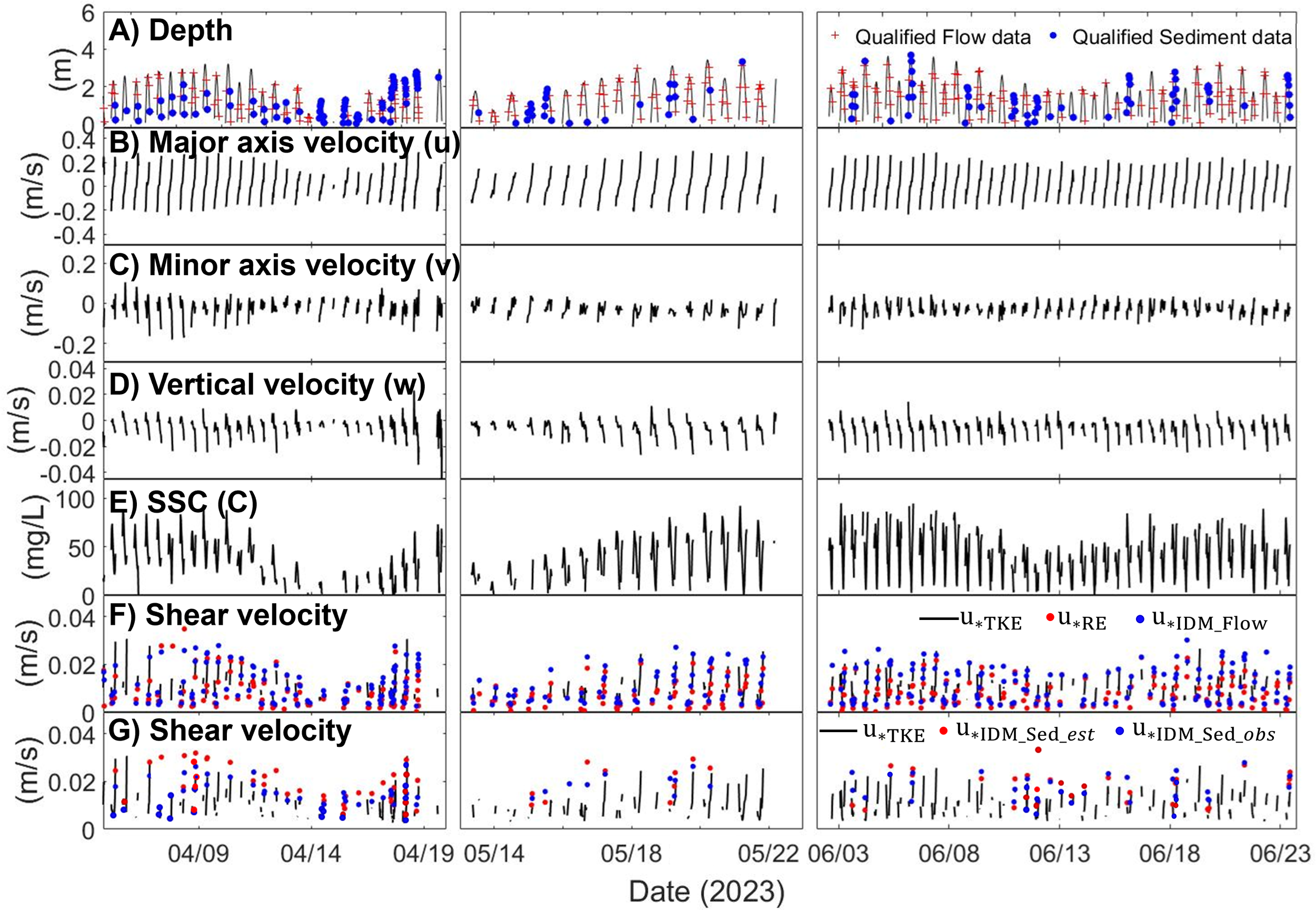 Time series of water depth, current velocity, SSC, and shear velocity. (A) Water depth. Red crosses indicate bursts qualified by IDM_Flow, while blue dots indicate bursts qualified by IDM_Sed. (B) Major axis current velocity. (C) Minor axis current velocity. (D) Vertical velocity. (E) SSC at 45 cm above the seabed, derived from vector amplitude. (F) Shear velocity estimated from current velocity. The black solid line represents shear velocity calculated using the TKE method, red dots represent shear velocity calculated using the Reynolds method, and blue dots represent shear velocity calculated using the IDM_Flow method. (G) Shear velocity calculated from IDM_Sed with ws,est and ws,obs. Shear velocities using TKE (u*TKE) are also shown for comparison.