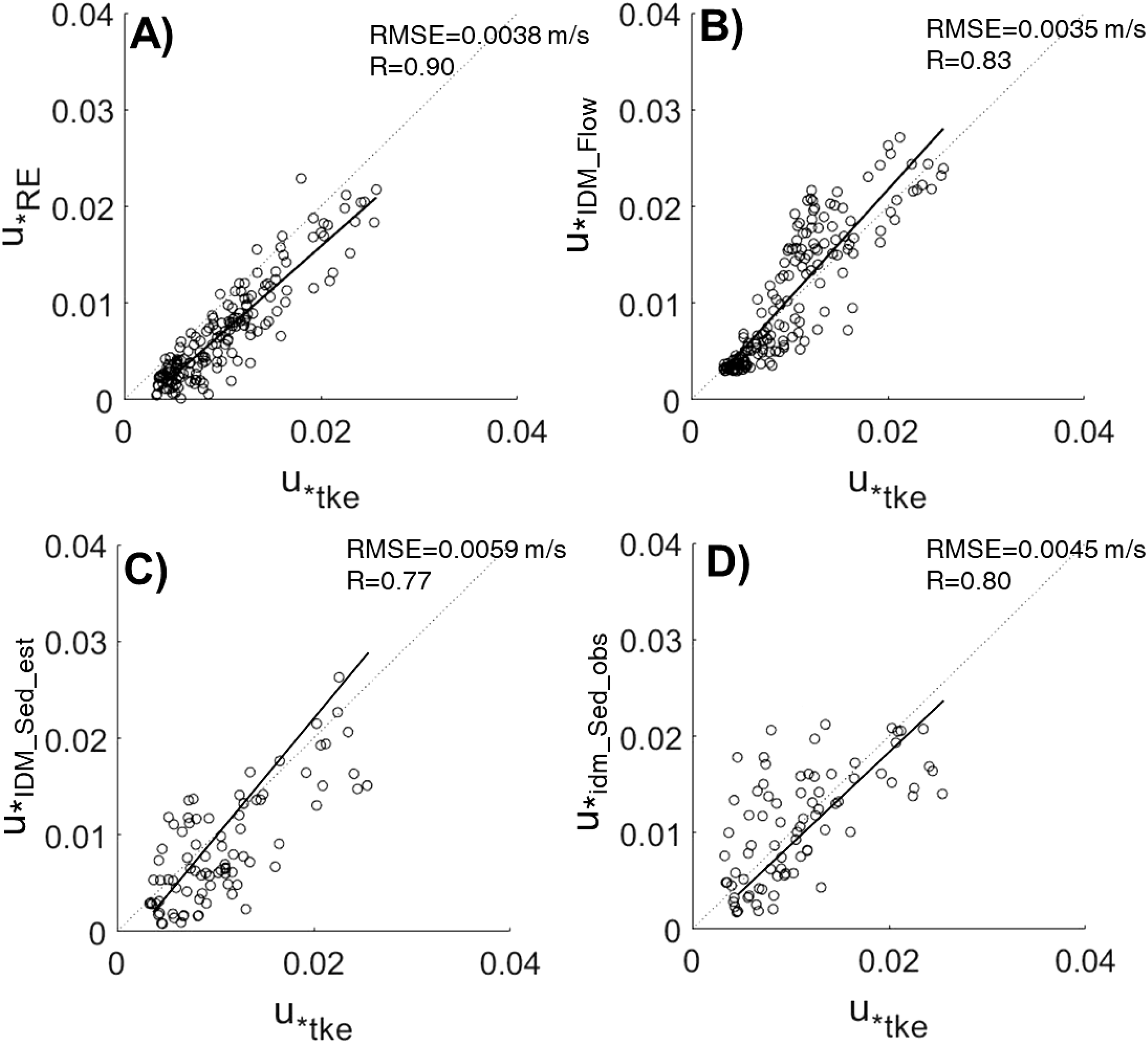 One to one comparison of shear velocity estimates. (A) Shear velocities estimated by the Reynolds stress () against those estimated by the TKE method (). (B) Shear velocities estimated by the inertial dissipation method for flow () against those estimated by the TKE method (). (C) Shear velocities estimated by the inertial dissipation method from SSC with estimated ws () against those estimated by the TKE method (). (D) Shear velocities estimated by the inertial dissipation method from SSC with observed ws () against those estimated by the TKE method (). Root mean squared errors and correlation coefficients are included for comparison. The black dashed line represents the one-to-one line, and the black solid line represents the regression line.