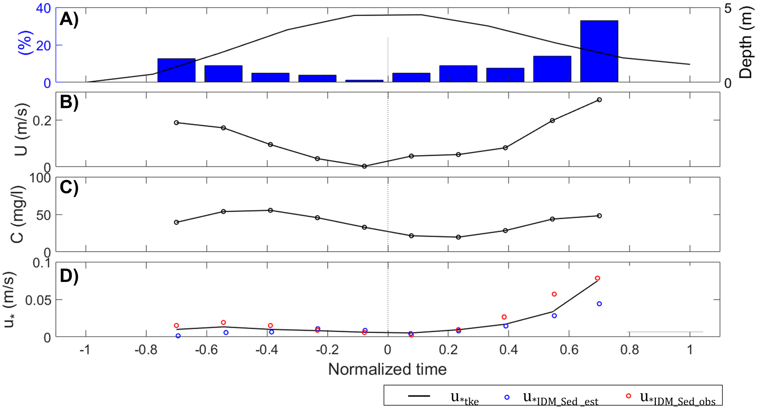 (A) Tidal phase-averaged water depth and percentage of shear velocity. (B) Tidal phase-averaged current velocity in the major axis. (C) Tidal phase-averaged SSC. (D) Tidal phase-averaged shear velocity; Black line – u*TKE; Blue – u*IDM_Sed,est; Red – u*IDM_Sed,obs. Negative normalized time represents flood tide, positive normalized time represents ebb tide, and 0 indicates high tide slack.