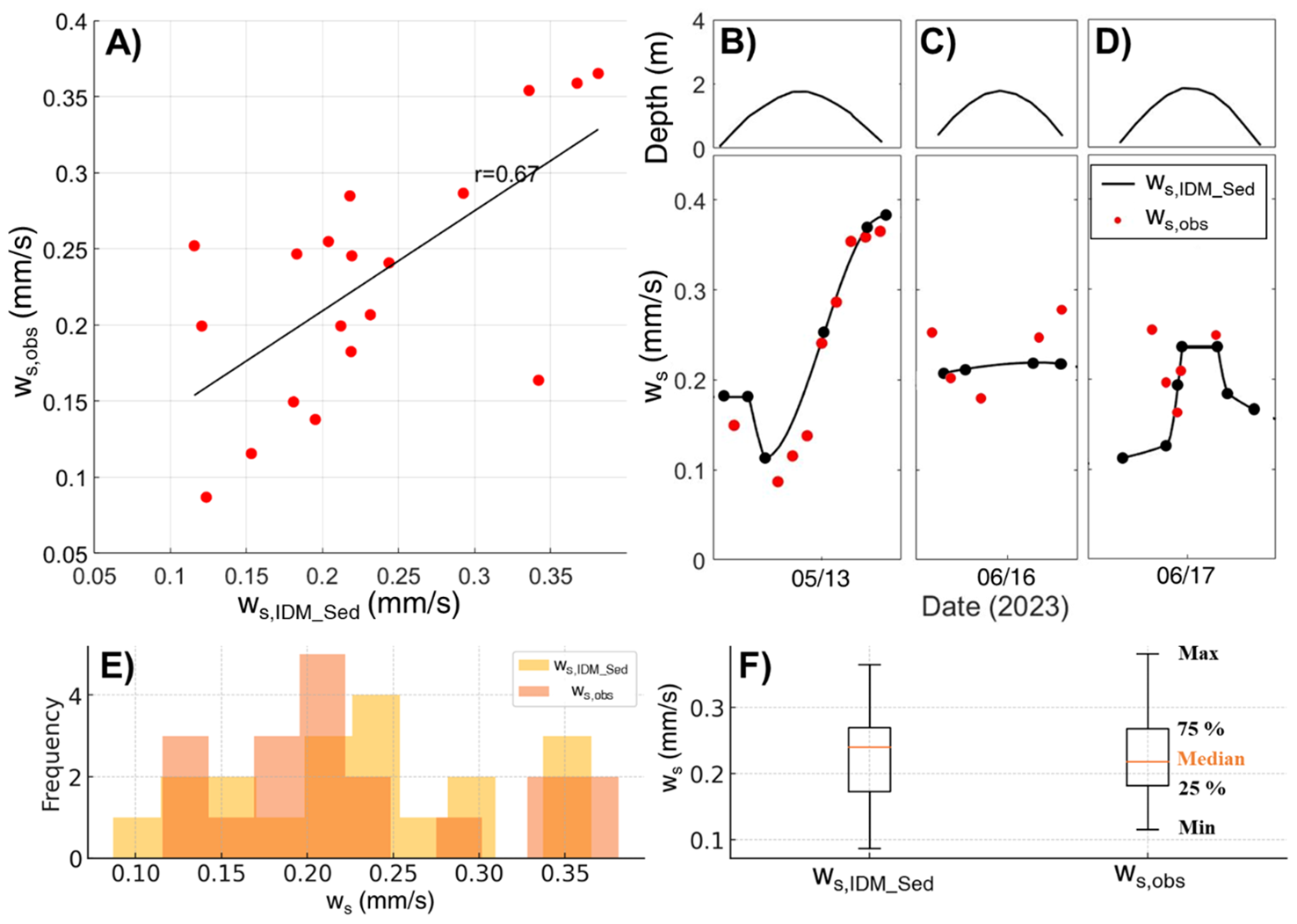 A new method presented in Equation 17 was applied to estimate settling velocities, which were validated through comparison with field-observed velocities obtained from a floc camera. Using quality-controlled velocity data, shear stress based on the TKE method was calculated and then substituted into Equation 17 to estimate the settling velocities (ws,IDM_Sed). These estimates were compared with in-situ observations from the floc camera (ws,obs) for 19 samples, where calculated TKE shear stress and observed settling velocities overlapped (Figure 4). For a quantitative evaluation, correlation analysis, histogram-based distribution comparisons, and statistical assessments using box plots were conducted. Additionally, the Root Mean Squared Error (RMSE, Equation 18) and Mean Absolute Percentage Error (MAPE, Equation 19) were calculated to analyze the agreement between the estimated and observed settling velocities.