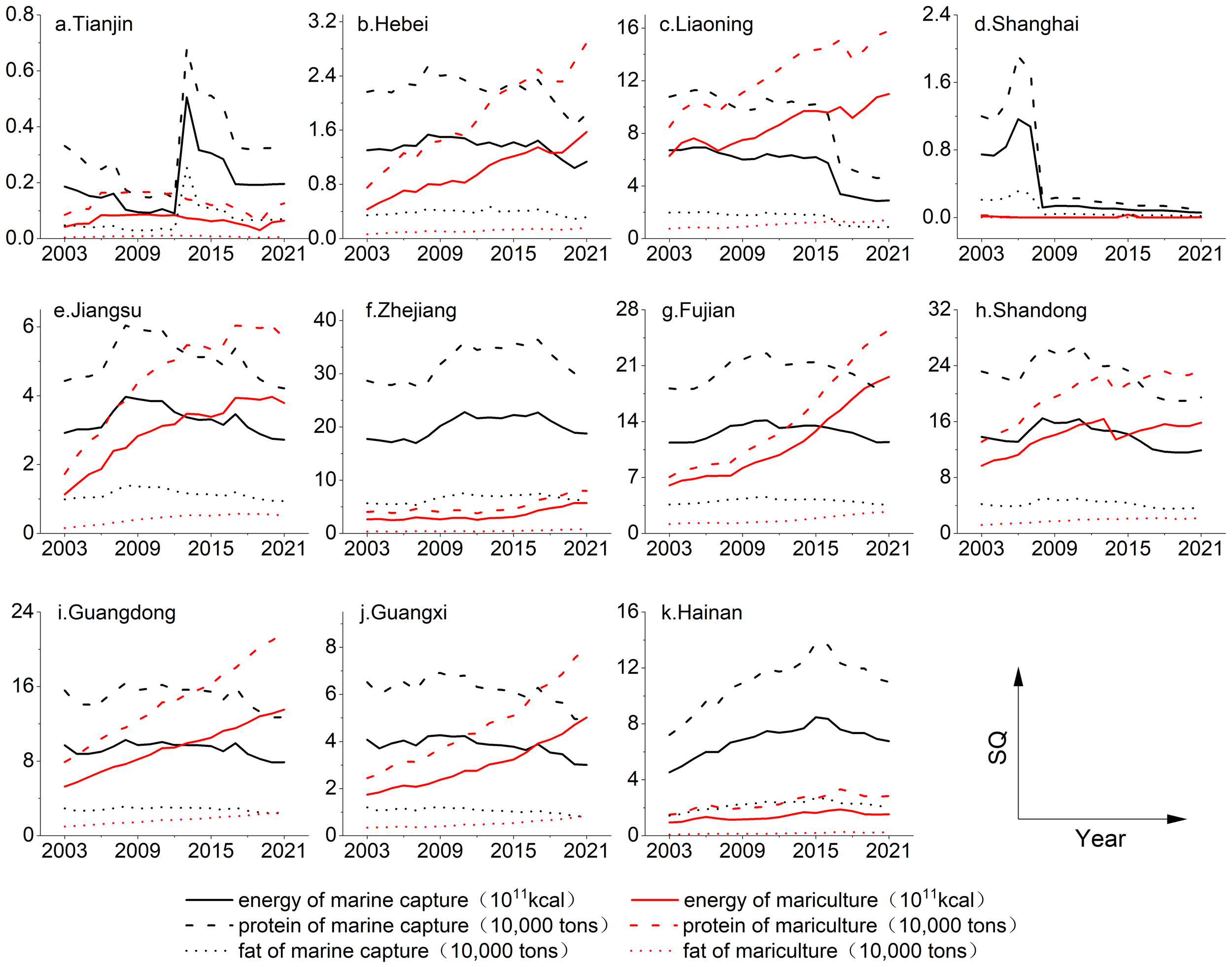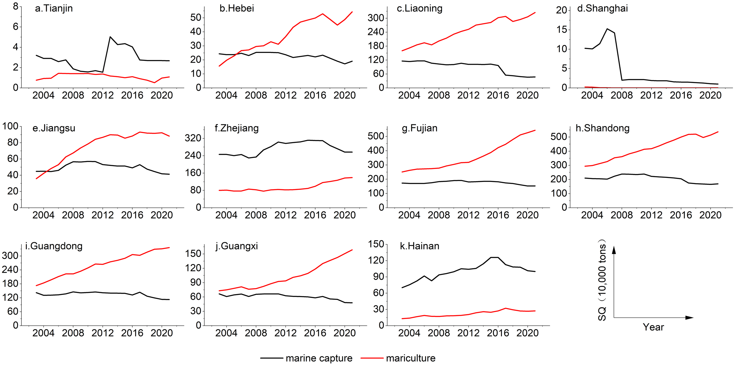 (A–K) Changes of food supply in marine capture and mariculture in coastal areas of China from 2003 to 2021.
