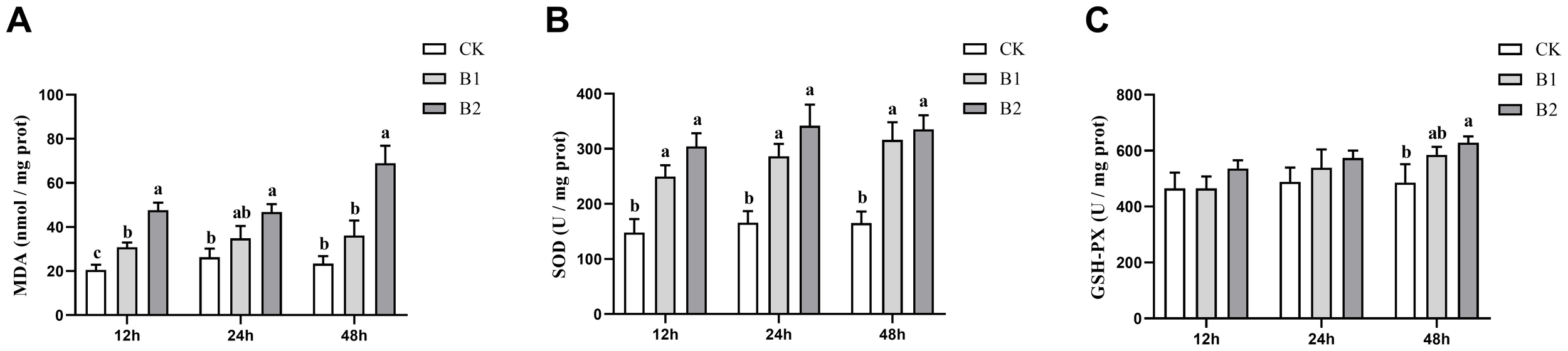 The expression levels of the anti-apoptotic gene Bcl-2 showed a substantial drop after 24 and 48 h of exposure in both the B1 and B2 treatment groups. The B2 group exhibited the lowest expression level (0.72-fold of the control group) after 48 h of stress, as seen in Figure 4A. The levels of expression for pro-apoptotic genes Bax and Caspase3 showed a substantial drop after 12 h of stress in the B1 and B2 treatment groups. Conversely, there was a rise in expression levels after 48 h of stress, as seen in Figures 4B, C.