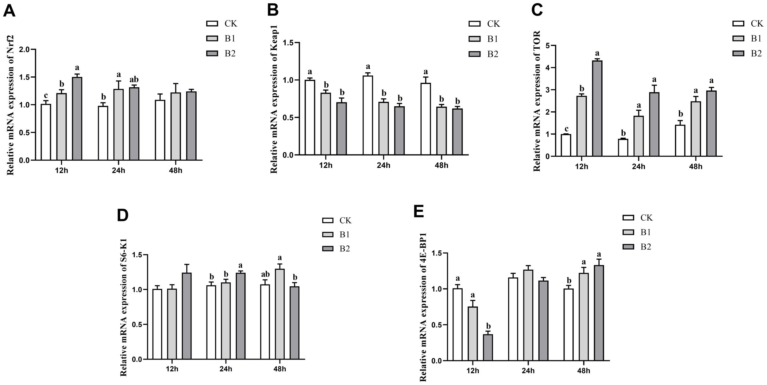The mRNA expression levels of Nrf2 exhibited a statistically significant increase (p < 0.05) compared to the control group after 12 h exposure to BuP in both the B1 and B2 groups. The B1 group was 1.21-fold and the B2 group was 1.50-fold of the control group. However, after 24 h of exposure, the B1 group was significantly higher 1.32-fold than the control group. Subsequently, after 48 h, no significant differences were observed in the treated groups (Figure 2A). The mRNA expression levels of Keap1 in the B1 and B2 groups exhibited substantial reductions compared to the control group after 12, 24 and 48 h of exposure (Figure 2B). The levels of TOR mRNA expression exhibited a significant elevation in all exposure groups after 12, 24 and 48 h of treatment (p < 0.05). Notably, the B2 group had the highest expression level at the 12 h time point of exposure was 4.32-fold of the control group (Figure 2C). The mRNA expression level of S6K1 exhibited a substantial rise in the B2 group after 24 h exposure was 1.24-fold of the control group. However, in the B1 group, there was a significant increase in S6K1 mRNA expression after 48 h of exposure, which was 1.30-fold of the control group, but in the B2 group, a reduction in expression was seen (Figure 2D). The mRNA expression level of 4E-BP1 exhibited a significant decrease in the B2 group after 12 h of exposure was 0.37-fold of the control group. However, these levels showed recovery after 24 h of exposure. Subsequently, both the B1 and B2 groups demonstrated a significant increase in 4E-BP1 mRNA expression levels after 48 h of exposure (1.22-, 1.33-fold of the control group, respectively), with a notable distinction when compared to the control group (p < 0.05; Figure 2E).