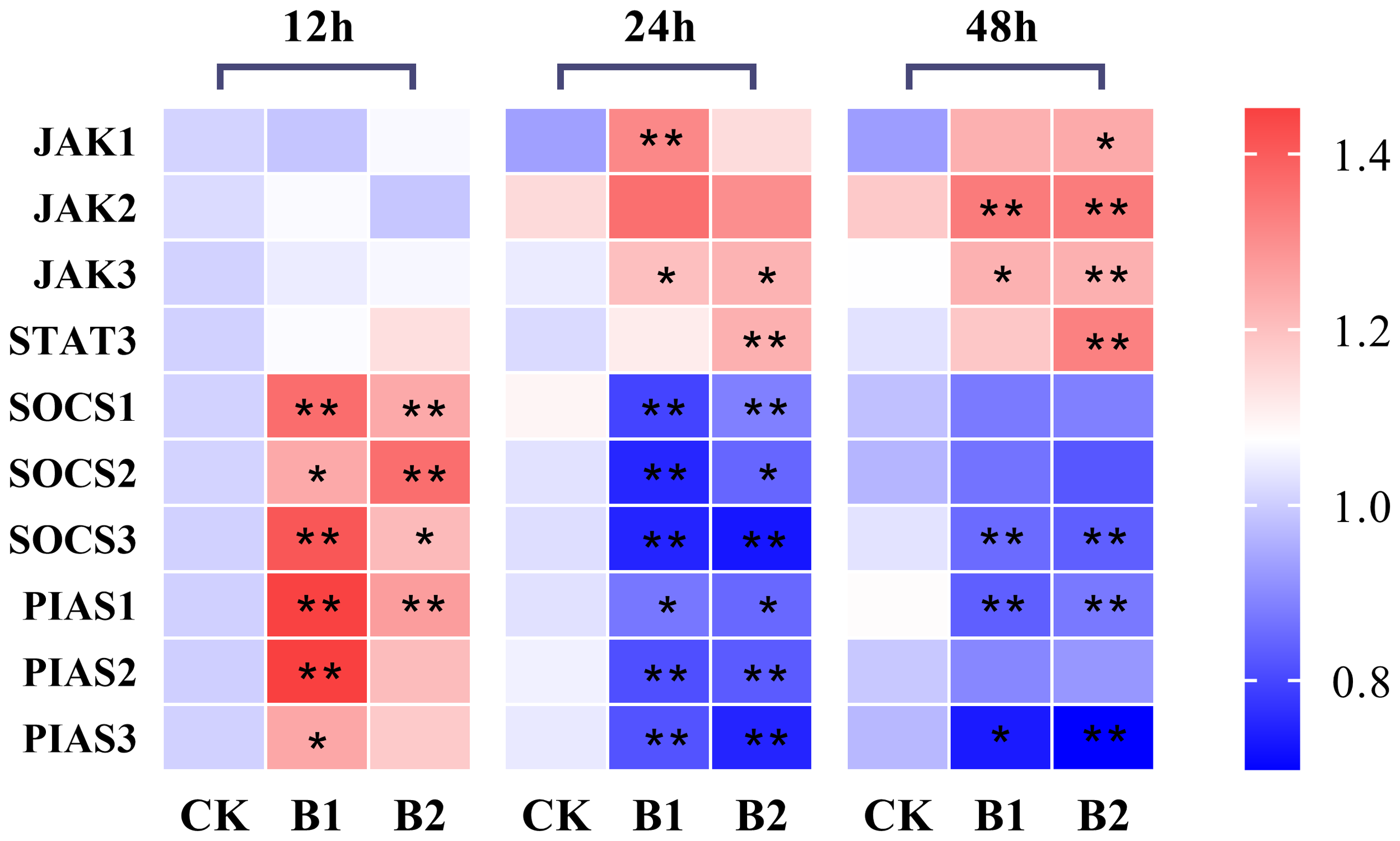 The heatmap of the mRNA expression of JAK-STAT pathway genes under BuP stress at different sampling times in the liver of P. megacephalus tadpoles. The symbol of * means significant difference when p < 0.05, ** highly significant difference when p < 0.01.