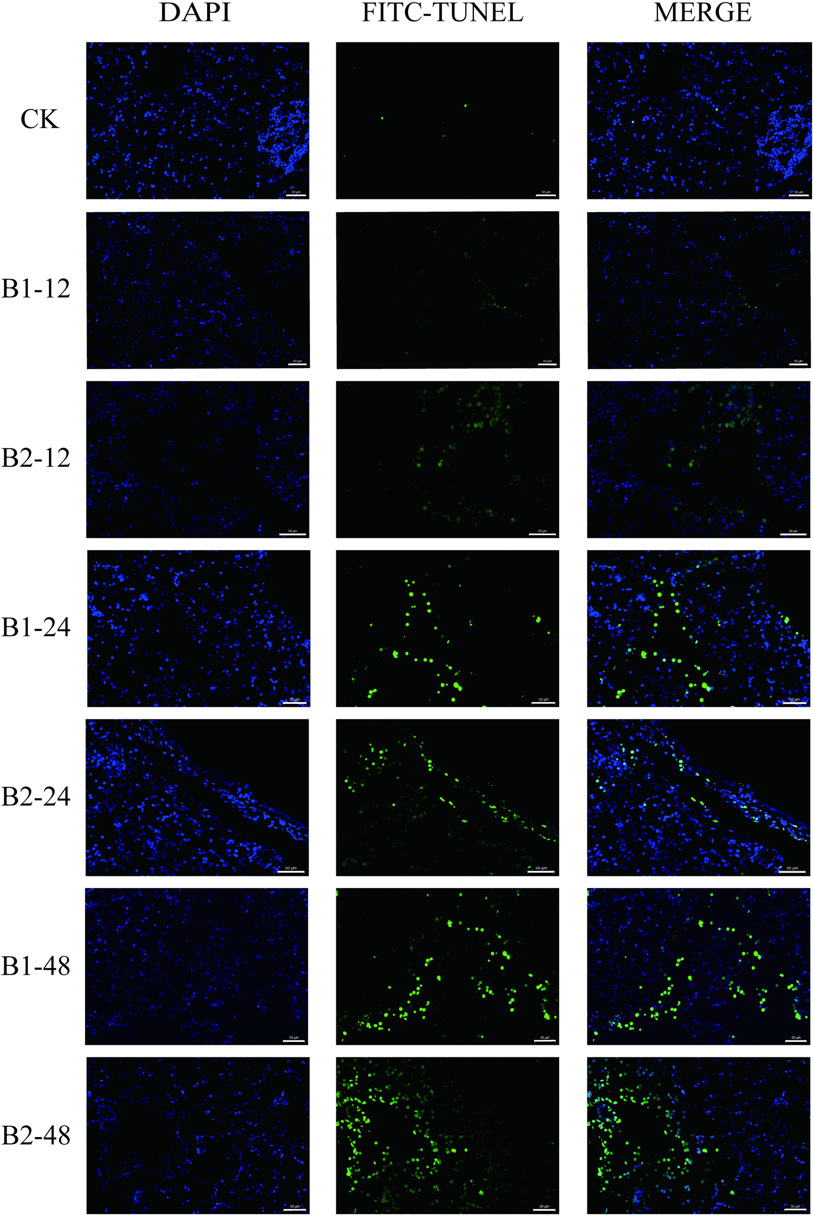 Apoptosis of liver cells in P. megacephalus tadpoles. CK, control group; B1-12, B1-24 and B1-48: B1 group sampling at 12, 24 and 48h; B2-12, B2-24 and B2-48: B2 group sampling at 12, 24 and 48h. Note: The first column showed the nucleus (blue); the second column showed the positive cell of apoptosis (green); the third column showed the merge; bar = 50 μm.