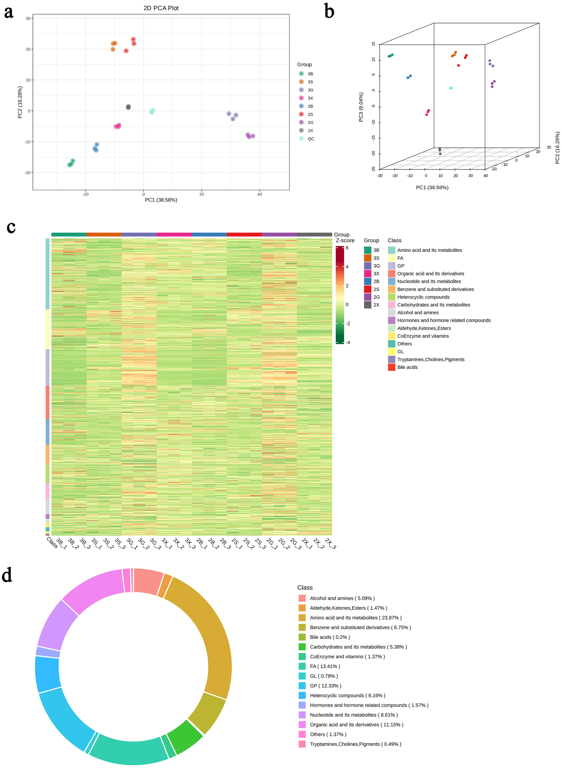 Identification of metabolites in triploid and diploid C. angulata.(A) Principal Component Analysis (PCA) plot in 2D showing clear metabolomic differentiation; (B) PCA plot in 3D showing separation of metabolites; (C) Heatmap visualization of all metabolite classes; (D) Circular graph representing the proportions of different metabolite classes.