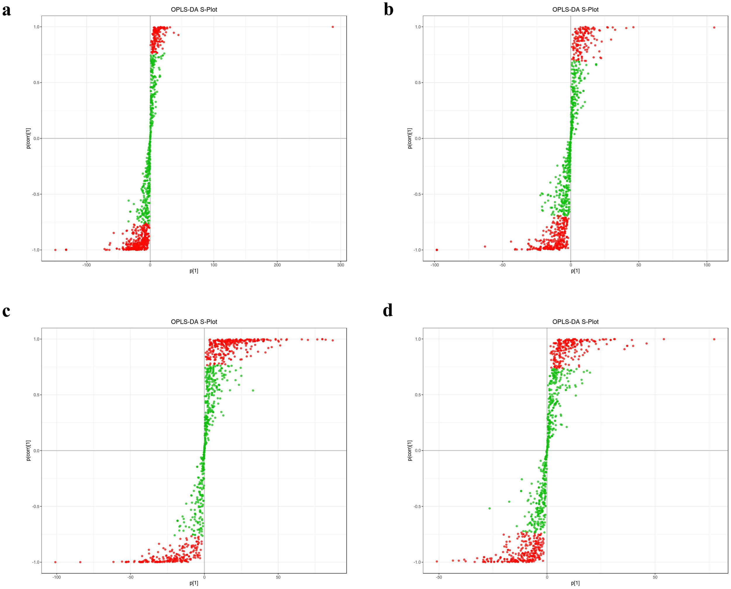The S-plot from the OPLS-DA analysis uses the horizontal axis to represent the covariance and the vertical axis to show the correlation between principal components and metabolites (Figure 3). Metabolites positioned near the upper right and lower left corners of the plot are indicative of more significant differences (Figures 3A–D).