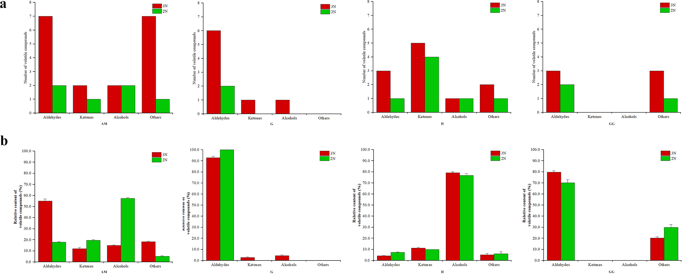 Number and relative content of volatile compounds in triploid (3N) and diploid (2N) C. angulata across different tissues. (A) Number of volatile compounds in each tissue; (B) Relative content of volatile compounds (percentage) in each tissue.