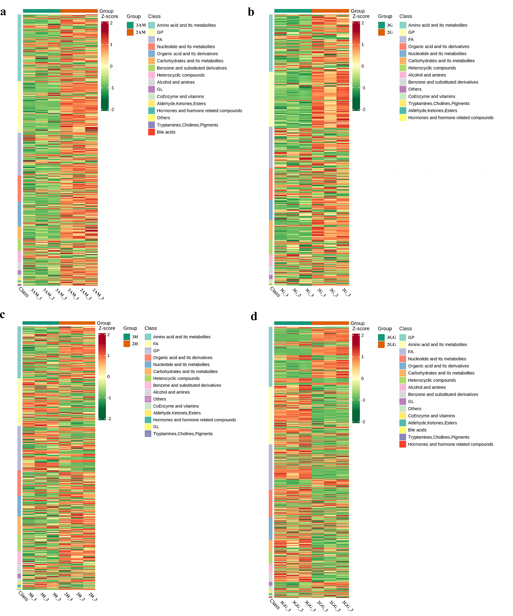 Heat map visualization of the metabolites of Triploid and Diploid of C. angulata samples in different parts. (A) Heat map visualization of The 3AM_vs_2AM; (B) Heat map visualization of The 3G_vs_2G; (C) Heat map visualization of 3H_vs_2H; (D) Heat map visualization of 3GG_vs_2GG.