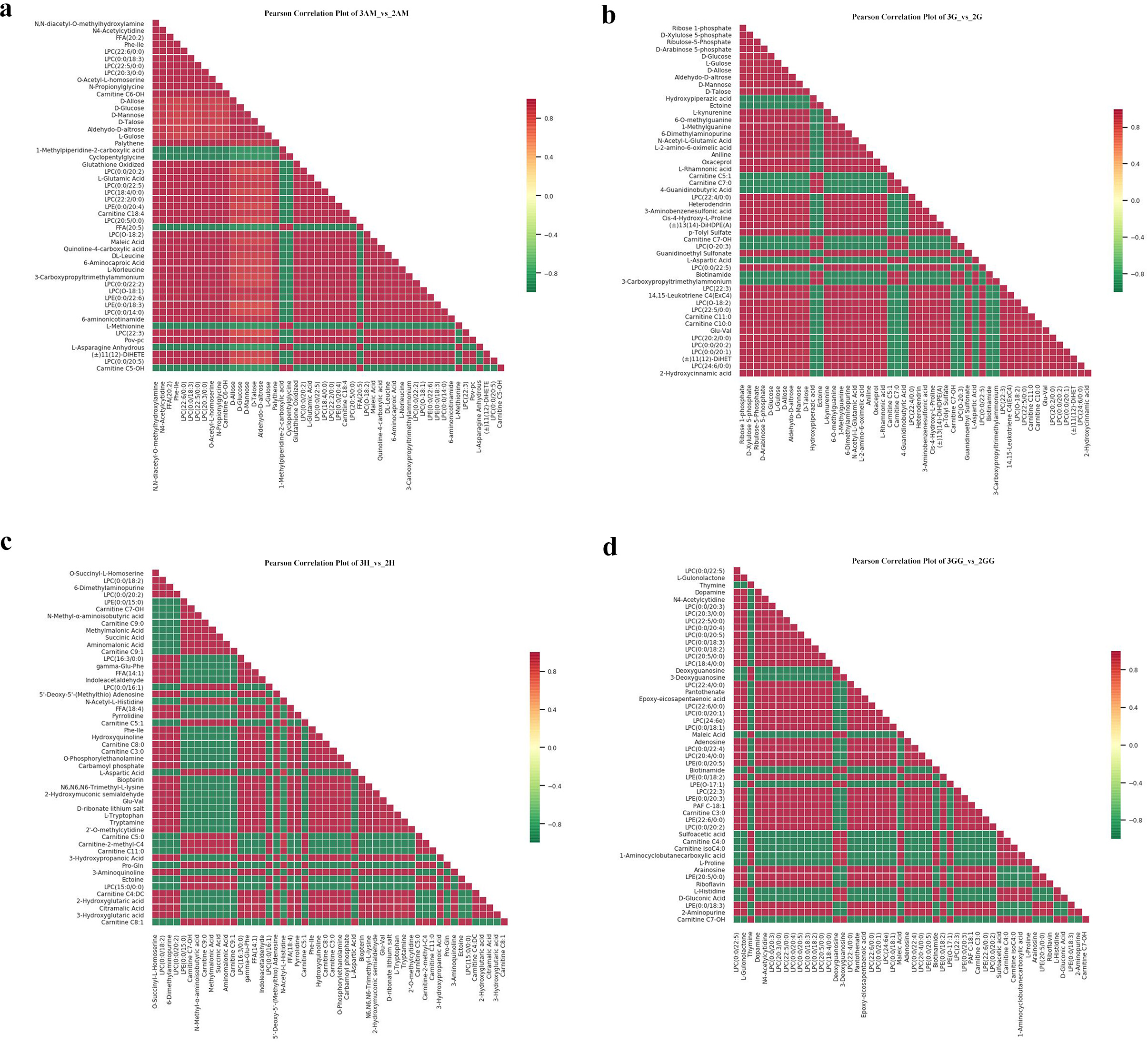 Correlation map of the metabolites for Triploid and Diploid C. angulata in different parts. (A) The 3AM_vs_2AM; (B) The 3G_vs_2G; (C) The 3H_vs_2H; (D)The 3GG_vs_2GG.
