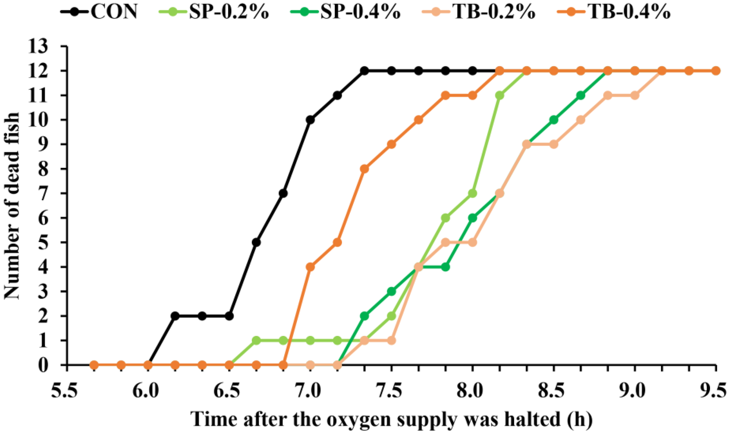 Hypoxic stress causes severe losses in farmed spotted seabass, thus the 8-week feeding experiment was followed by a hypoxic stress experiment. The CON fish began to die after 6 h after the oxygen supply was halted (the dissolved oxygen in each group reduced to approximately 1 mg/L), and all CON fish died after 7 h after oxygen was halted, demonstrating the weakest hypoxia resistance in all groups (Figure 1). Notably, all the SP and TB fish began to die later than that of the CON fish. The SP-0.4% and TB-0.2% fish began to die last, and the total death time in the SP-0.4% and TB-0.2% groups was also the longest, as it was ~2 h longer than that of the CON group, indicating stronger hypoxia stress resistance.
