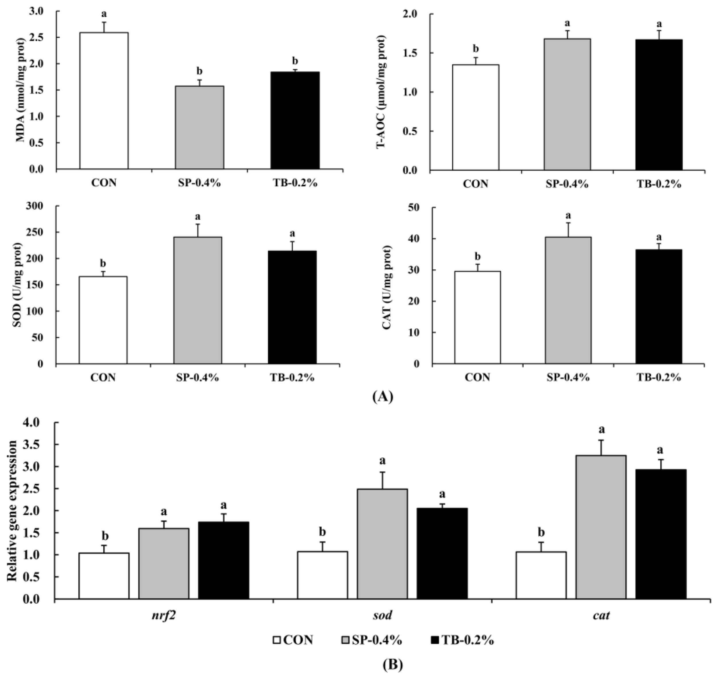 Effects of SP and TB dietary supplementation on antioxidant capacity. (A) MDA, T-AOC, SOD, and CAT levels. (B) Relative gene expression levels of nrf2, sod, and cat. Mean values (mean ± SEM, n = 4) with different letters are significantly different (P < 0.05).