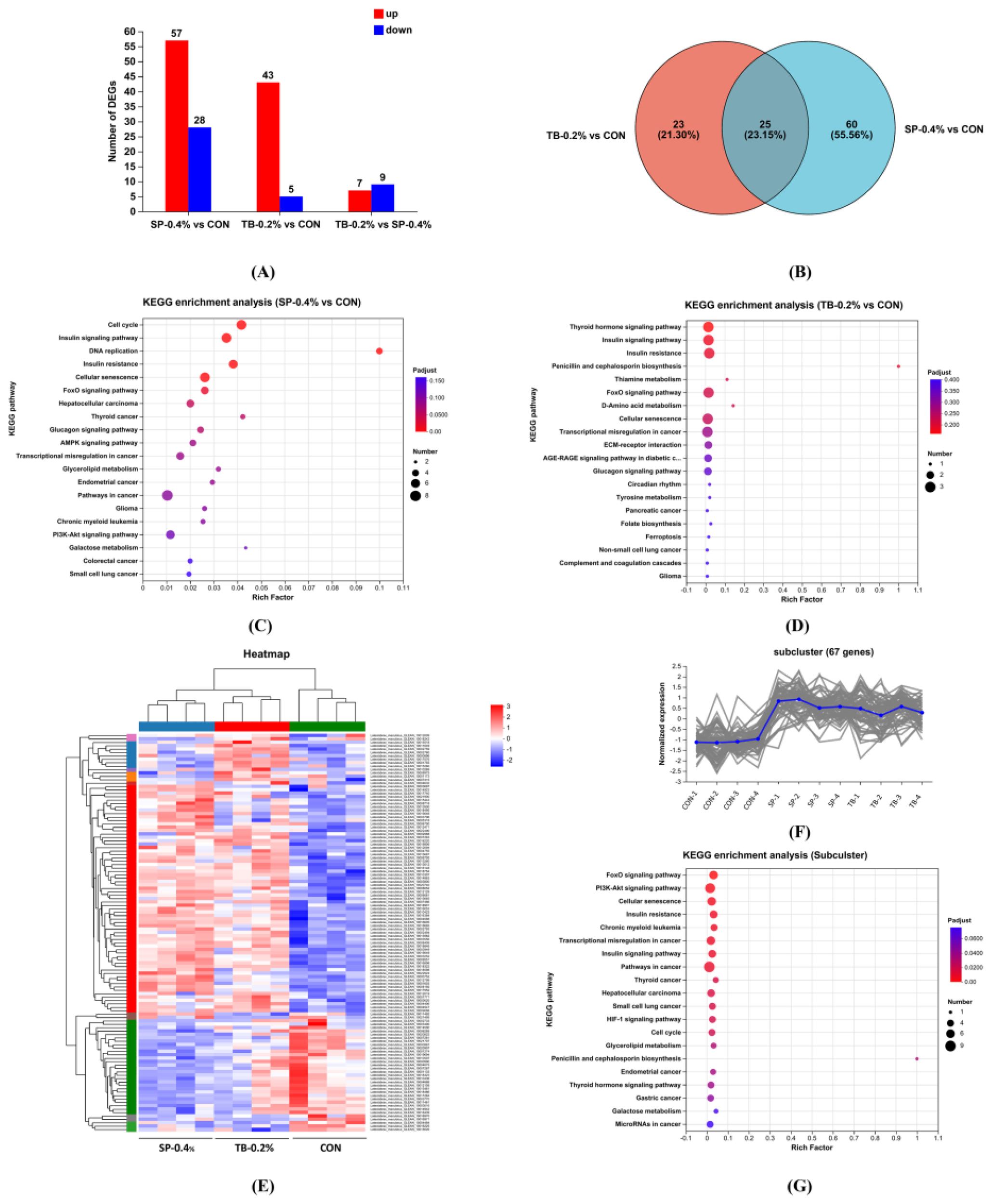 RNA-seq of SP and TB dietary supplementation. (A) The number of differentially expressed genes. (B) Venn diagram of the differentially expressed genes. (C) KEGG enrichment analysis of SP-regulated genes. (D) KEGG enrichment analysis of TB-regulated genes. (E) Heatmap analysis of differentially expressed genes. (F) Subcluster of 67 genes. (G) KEGG enrichment analysis of 67 genes.