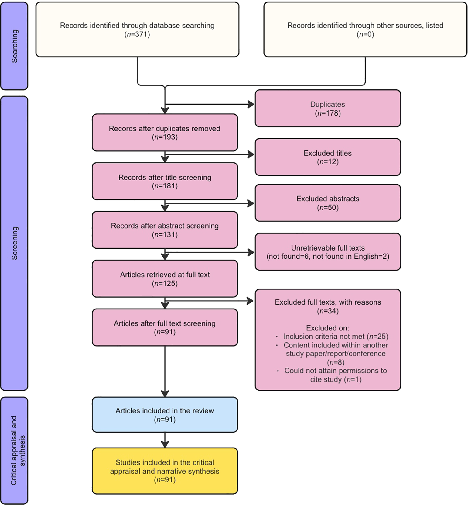 ROSES flow diagram documenting the steps taken to source, screen and appraise studies in the systematic review.