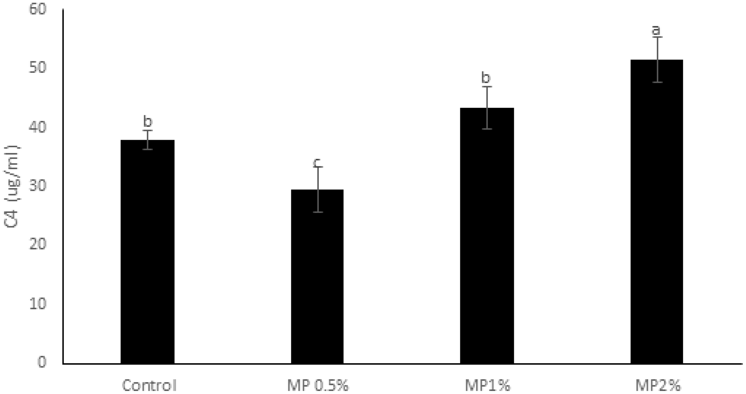 The effects of different levels of MP on complement system activity are shown in Figures 1, 2. According to the results, the use of MP in the beluga diet at any tested levels showed no significant change in the complement C3 activity (P >0.05). The C4 activity in the MP 0.5% group showed a significant decrease compared to the control group (P<0.05), whereas the MP 2% group exhibited a significant increase in C4 levels relative to the control group (P<0.05).