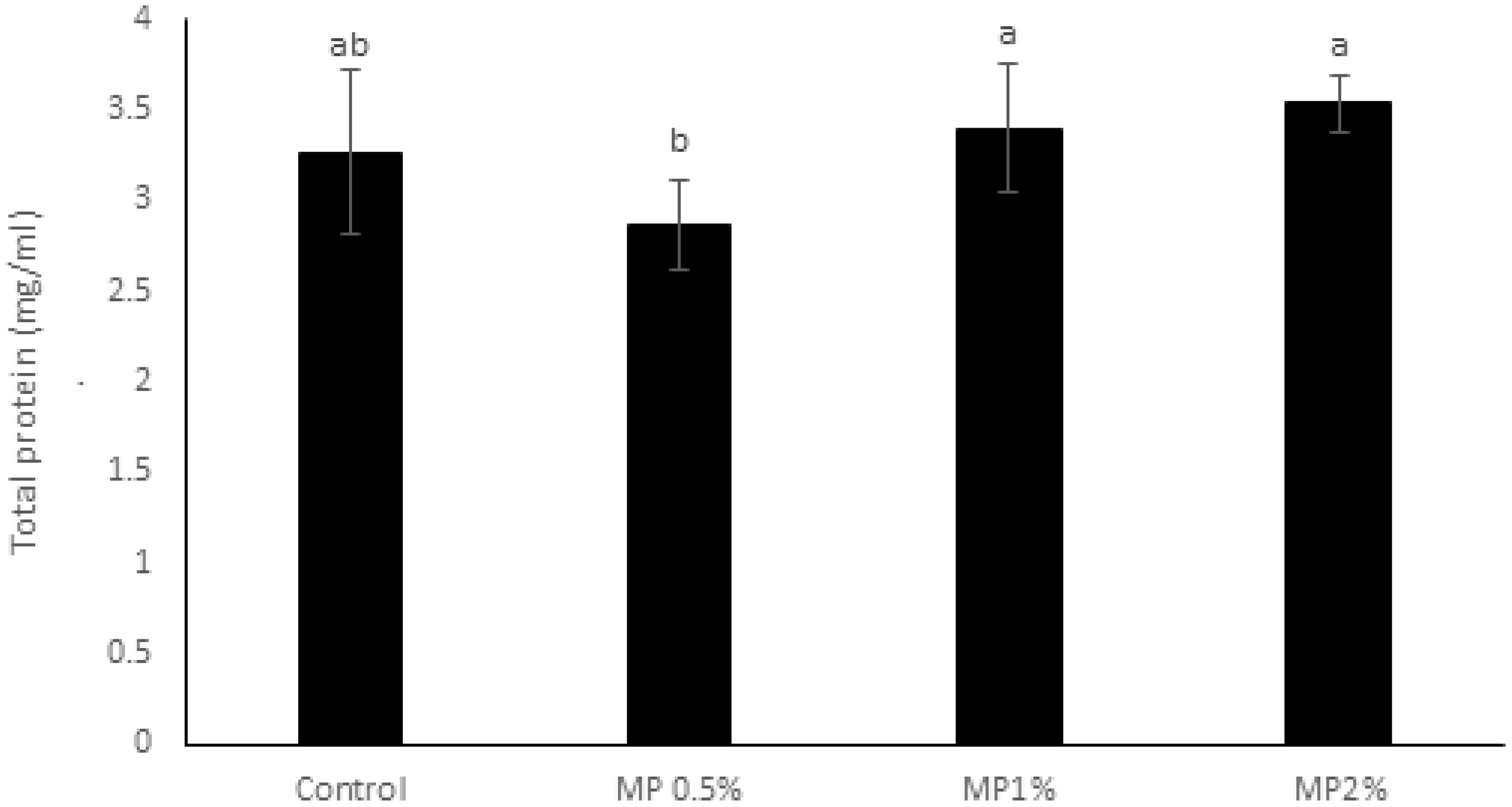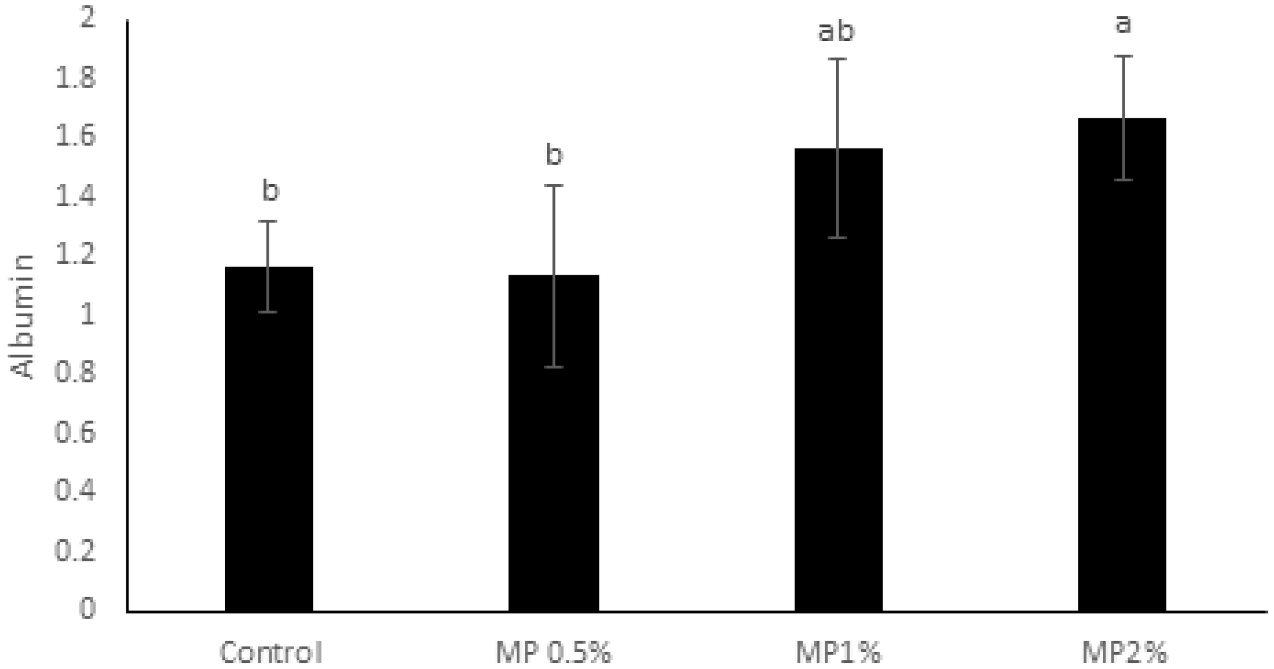 The effect of MP incorporation in beluga diet on serum total immunoglobulin is presented in Figure 3. Total immunoglobulin significantly decreased in the fish fed 0.5% and 2% MP compared with control (P<0.05), whereas no significant difference was noticed in terms of this parameter between the fish fed 1% MP and control (P >0.05).
