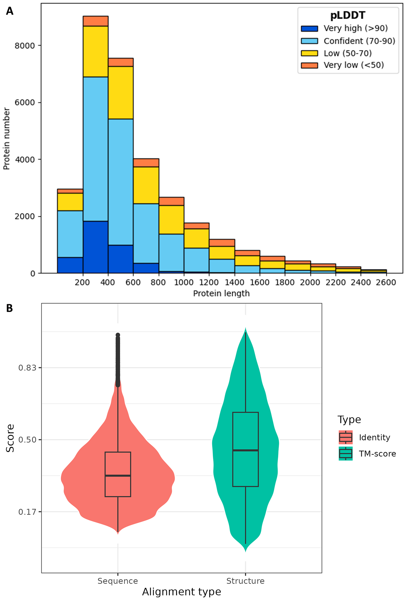 Statistics of COTS proteome structuring. (A) Distribution of model confidence against protein length. Horizontal axis is protein length and vertical axis is protein number. Model confidence calculated by pLDDT is color-coded. Very high: pLDDT > 90; confident: 90 > pLDDT > 70; low: 70 > pLDDT > 50; very low: pLDDT < 50. (B) Violin plot of structure alignment between COTS structural proteome and AlphaFold Clusters. Horizontal axis is alignment type, for Foldseek performs structure alignment while also calculating sequence alignment. Vertical axis is alignment score, with identity corresponding to sequence alignment and TM-score to structure alignment.