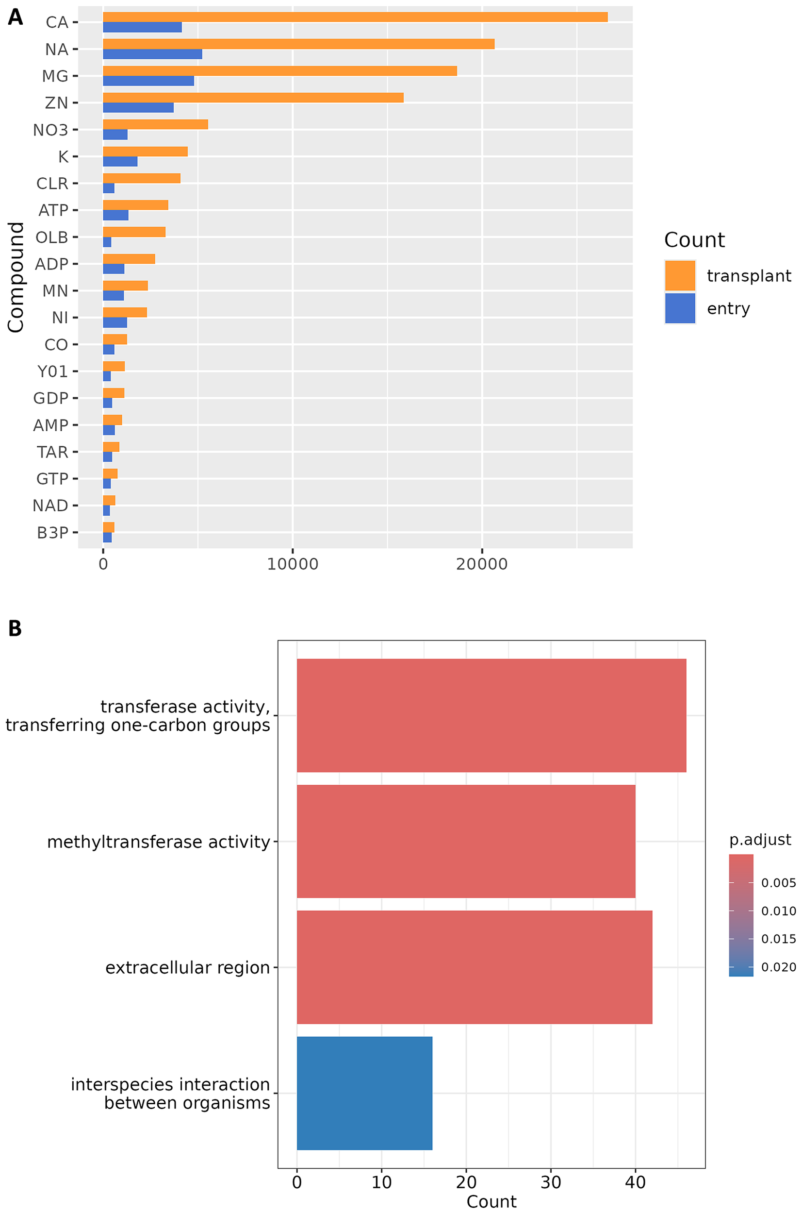 Structure-based function annotation of COTS structural proteome. (A) Statistics of the top-20 compounds with largest number of transplants. The horizontal axis is the number of entries and transplants, and the vertical axis is PDBe ligand code. CA, Calcium(2+) ion; NA, Sodium(1+) ion; MG, Magnesium(2+) ion; ZN, Zinc(2+) ion; NO3, Nitrate ion; K, Potassium(1+) ion; CLR, Cholesterol; ATP, Adenosine triphosphate; OLB, 1-Oleoyl-sn-glycerol; ADP, Adenosine diphosphate; MN, Manganese(2+) ion; NI, Nickel(2+) ion; CO, Cobalt(2+) ion; Y01, Cholesterol hemisuccinate; GDP, Guanosine diphosphate; AMP, Adenosine monophosphate; TAR, d-Tartaric acid; GTP, Guanosine triphosphate; NAD, Nicotinamide adenine dinucleotide; B3P, Bis-Tris propane. (B) Bar plot of GO enrichment analysis of 701 representative uncharacterized proteins.