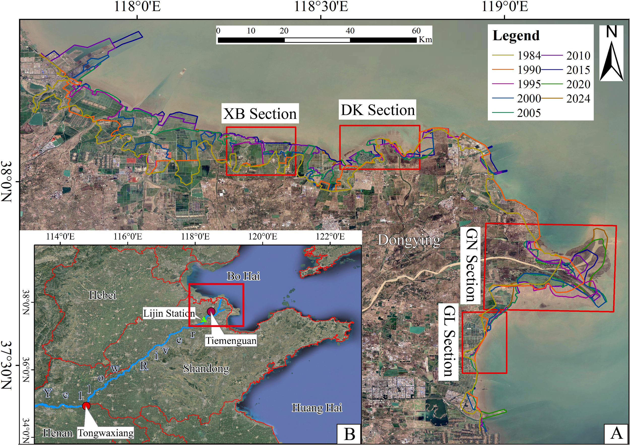 The YRD coastal zone exhibits a mutual constraint mechanism among the three elements of matter, energy, and space. When the balance of matter and energy is disrupted, the process of establishing a new equilibrium is manifested as the spatial advancement or retreat of the interaction region between these elements. The boundary changes between the old and new interaction regions are reflected as coastline changes on a planar surface (Gao et al., 2023; 2024). The modern YRD was formed after the Yellow River breached its levees at Tongwaxiang in Lanyang, Henan, in June 1855, diverting its course to Tiemenguan in Lijin County (Gao et al., 2018; Liu et al., 2018). This delta, shaped by the sediment load carried by the Yellow River, is continually elevated and expanded by natural forces such as waves and tides, resulting in extensive mudflat landscapes. It is one of the world’s most intact and youngest wetland ecosystems in the warm temperate zone. It serves as a major area for oil resources, coastal saltworks, and fisheries development in China. The YRD holds significant importance in global wetland ecosystem research and has substantial economic value (Zhu et al., 2024; Sun et al., 2024). However, the extensive development of the delta, land subsidence, rising relative sea levels, and intensified human activities have altered the environmental and ecological balance of the YRD (Wu et al., 2023; Wang et al., 2020). These changes have significantly reduced biodiversity (Fu, 2020), consequently affecting the cycle, accumulation, and storage of carbon within the wetland ecosystems (Maier et al., 2021). In 2020, with the proposal of the dual-carbon strategy, studying coastline changes in the YRD became crucial for understanding delta evolution in the context of human activities. This research provides scientific guidance for the comprehensive management, erosion prevention, and future high-quality development of the YRD (Liu, 2022).