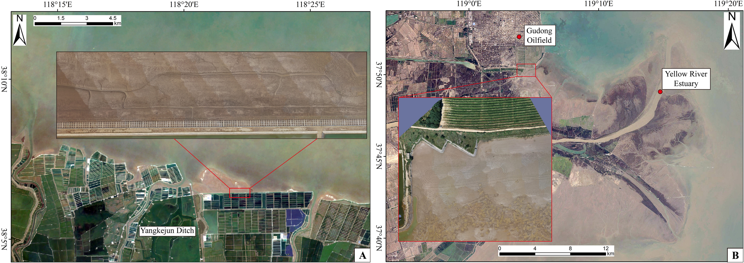 In this study, the coastline of the YRD stretches from Huanghua Port in Cangzhou City, Hebei Province, in the north to the Guangli River estuary in Dongying City, Shandong Province, in the south, located between 37°20′ and 38°31′32.10″N, and 117°45′ and 119°22′8.45″E (Figure 1). The artificial coastline within the study area primarily consists of the boundaries of aquaculture ponds and coastal dikes, while the natural coastline is predominantly silty and muddy (Wang et al., 2017). From 1984 to 2024, the YRD region has experienced extensive artificial development, land reclamation, port construction, as well as natural erosion and sedimentation, resulting in significant coastline changes (Liu, 2017; Fan, 2019; Chen et al., 2004; Fu Y. T. et al., 2021; Xing et al., 2016).