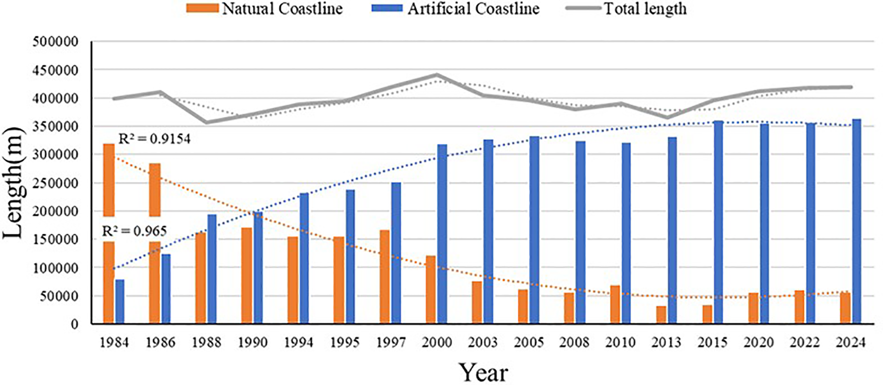 The interpreted region has an average total coastline length of 398.9 km, with the minimum and maximum values recorded in 1988 and 2000 at 357.2 km and 440.7 km, respectively. The period from 1984 to 2000 witnessed a rapid expansion of artificial coastlines, while the growth of these coastlines gradually stabilized after 2000. In contrast, the total length of natural coastlines experienced a general trend of reduction throughout most of the years between 1984 to 2024 (Table 2). Figure 3 represents a 2-period moving average analysis of the total coastline length, with a standard error of within 5%, indicating that the variations in total coastline length are relatively small compared to the total length, maintaining an overall balance. The primary reason for this stability is the alternating evolution between different types of coastlines within the region, where the increase in artificial coastlines compensates for the decrease in natural coastlines. Polynomial fitting results indicate that artificial coastlines have consistently shown a rapid growth trend, with an R² of 0.9154, while natural coastlines have exhibited a rapidly decreasing trend, with an R² of 0.965 (Figure 3).
