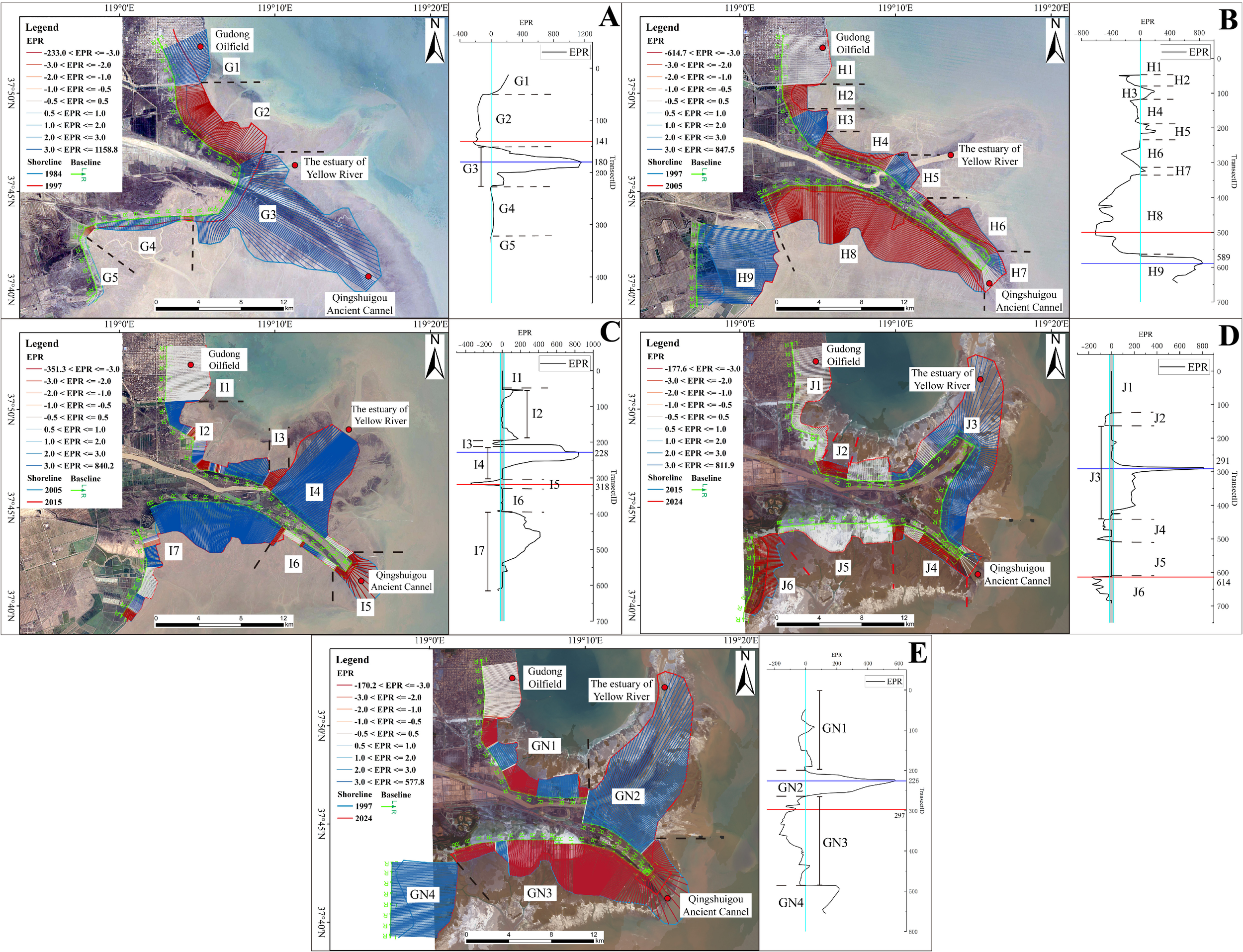 From 1984 to 2024, the XB section exhibited continuous accretion, with an average accretion rate of 186.97 m/a, a maximum accretion rate of 281.19 m/a, and the furthest coastline advancement reaching 11,247.52 m (Figure 5D and Supplementary Table 2D).