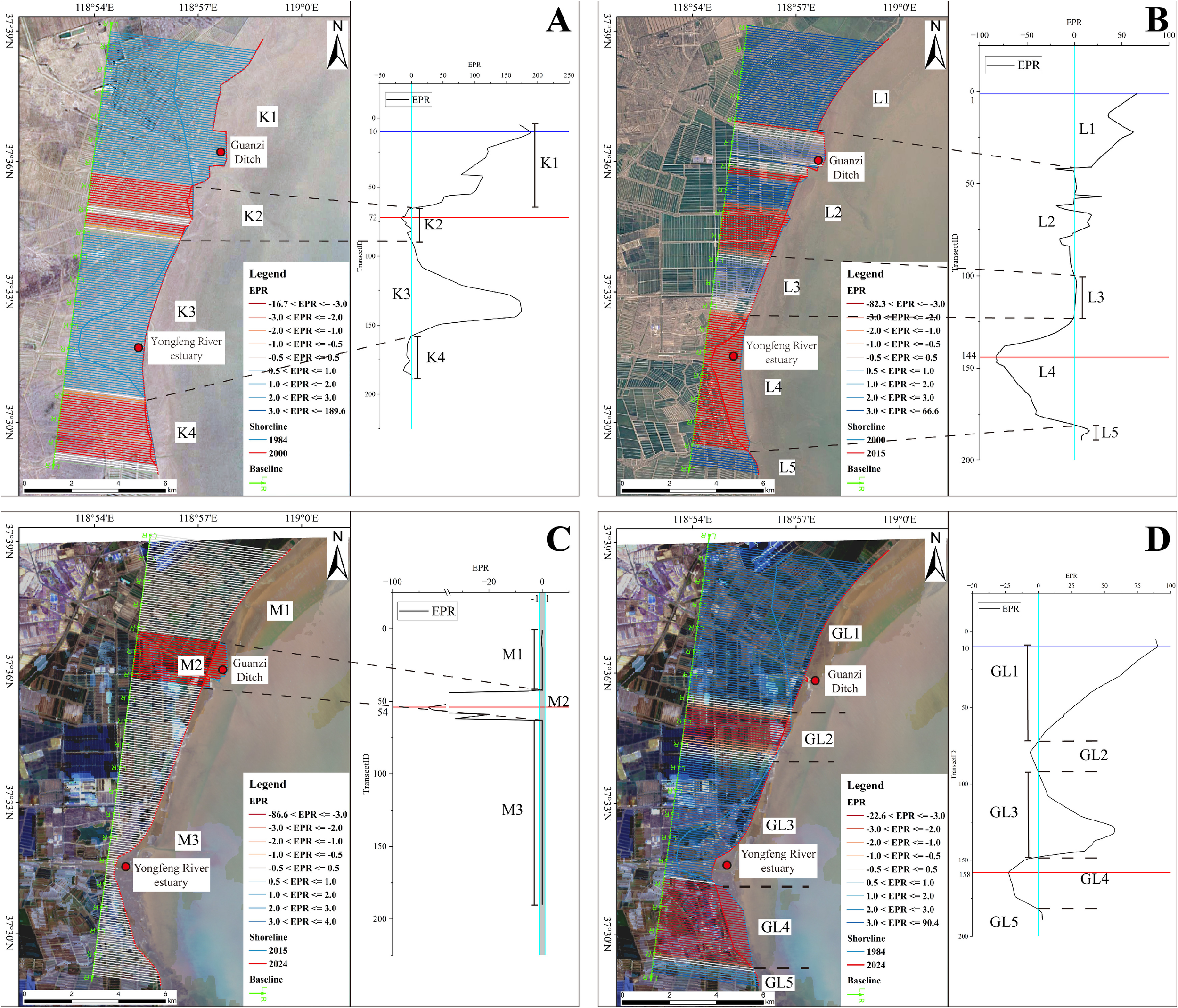 XB section coastline changes. (A) Rapid transition phase from 1984 to 2000; (B) Slow transition phase from 2000 to 2015; (C) Stable phase from 2015 to 2024; (D) Overview of XB section (Yangkejun Ditch) coastline changes from 1984 to 2024. The color lines of the vertical baseline are interpolated lines generated by the DSAS model, shown as EPR results in the figure.