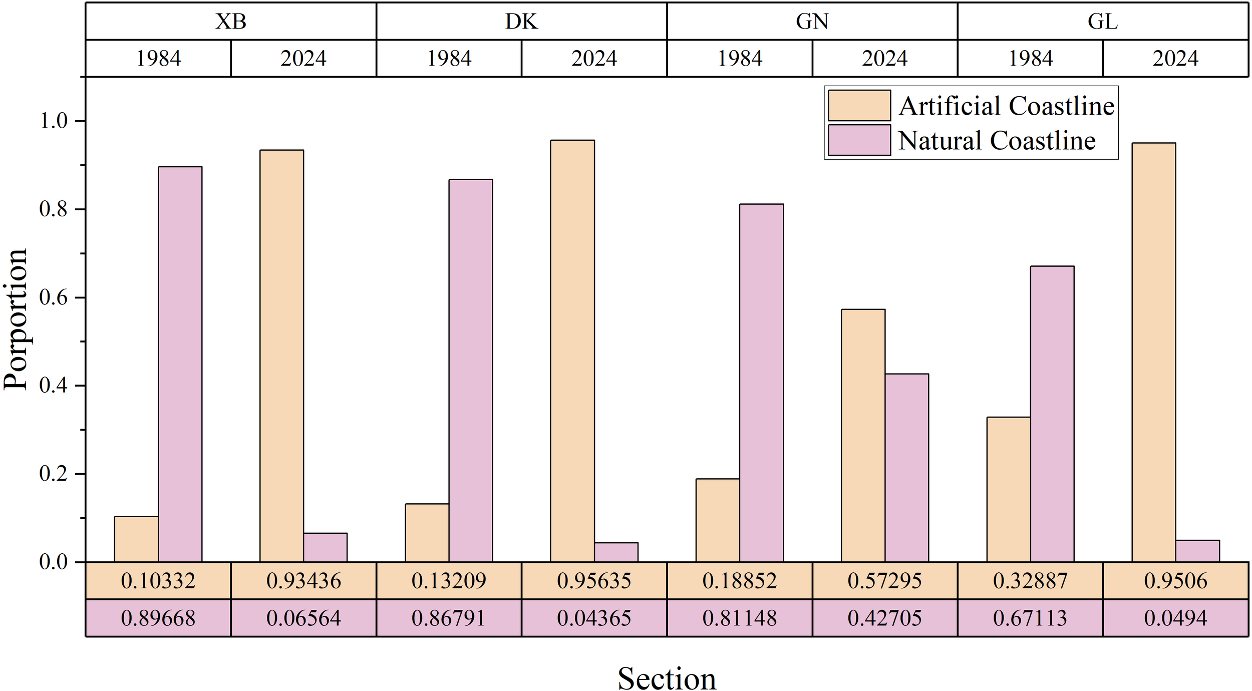 The Coastline Length, Proportion of YRD from 1984 to 2024.