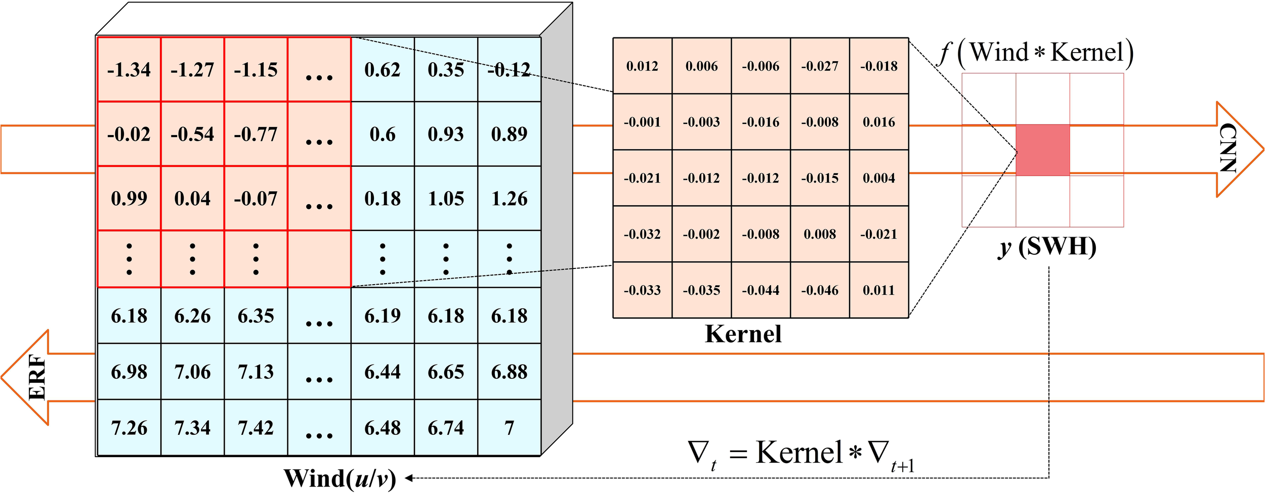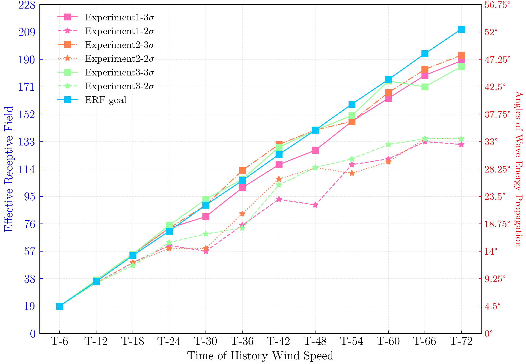 The process of wave energy diffusion is a crucial element in determining the wave state. In wave intelligent models, CNNs and convolutional structures can simulate regional wave states and avoid error accumulation caused by the iteration of network parameters during the training process. This lays the foundation for realizing global wave simulation. When designing the intelligent wave model, we tried to incorporate the range of wave energy diffusion to not only enhance the physical interpretation of the model but also improve the ability to simulate waves. Therefore, it is important to define the range of wave energy diffusion as well as establish the link between distance and the model’s ERF. Following previous studies on the relationship between dataset resolution and wave propagation (Jin et al., 2024; Zhang et al., 2024), our goal for the model’s ERF is represented by: